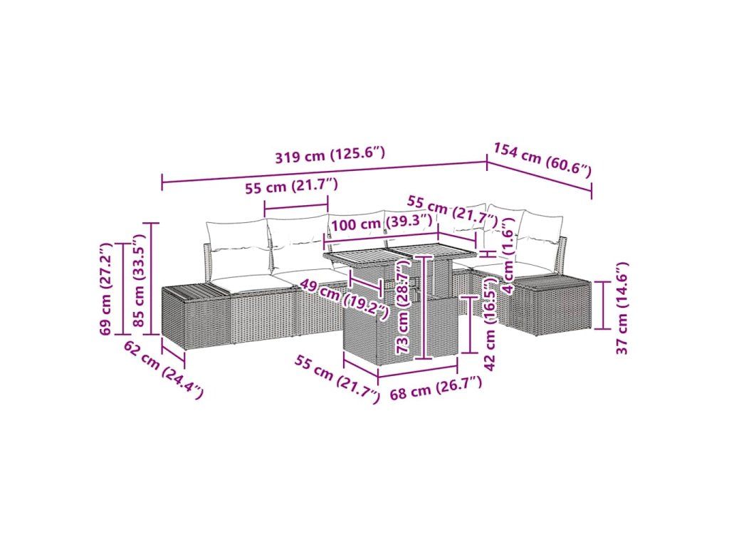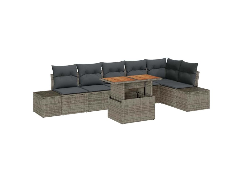 - Premyslené komponenty: Každý kus v sete, od stredných po rohové sedadlá, má integrované úložné funkcie, ktoré ti umožňujú jednoducho uskladniť vankúše a vonkajšie potreby. Operadlá a lakťové opierky sú tkané z pohodlného poly ratanu, podporujúc oddychovú polohu.