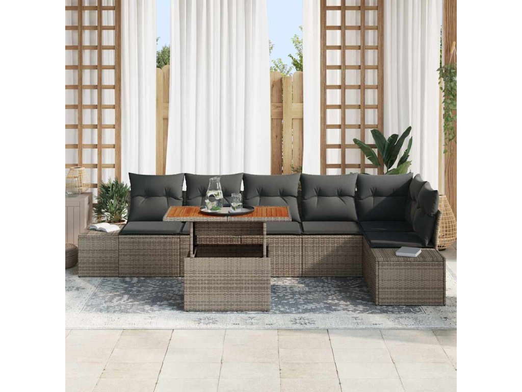 - Vysoko kvalitné materiály: Kombinovaný s poly ratanom pre jeho UV-odolné vlastnosti a oceľou s práškovou úpravou pre odolnosť, tento záhradný set zabezpečuje dlhú životnosť a krásu aj v drsných poveternostných podmienkach. Pevný akáciový drevený povrch dodáva teplý dotyk, elegantne kontrastujúc s ostatnými materiálmi a ponúkajúci dokončený vzhľad.