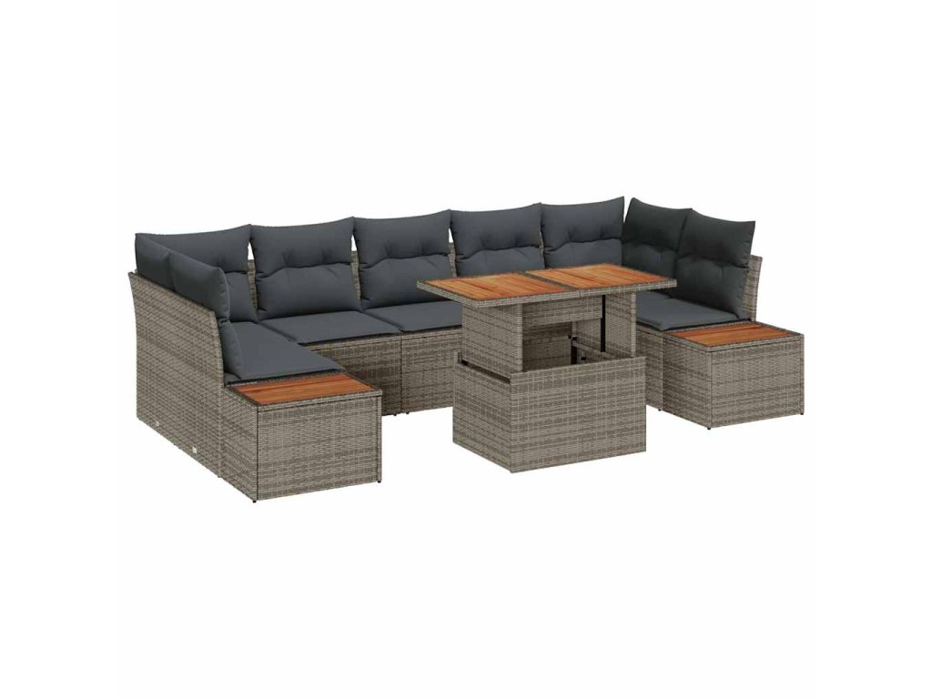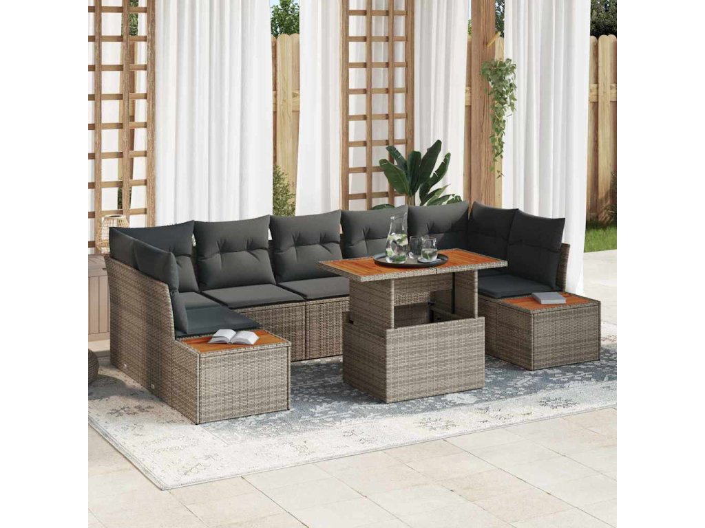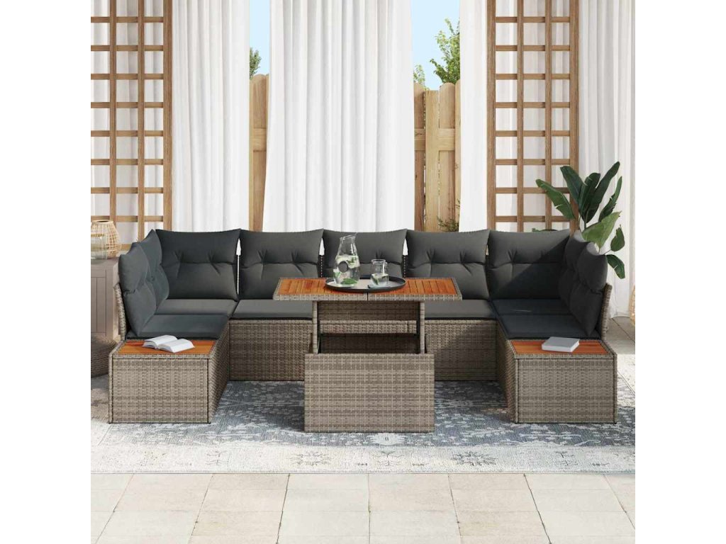 - Kvalitné materiály: Vyrobené z poly ratanu a ocele s práškovou úpravou, set má UV odolnosť a robustnosť. Rám ponúka silnú podporu voči vonkajším podmienkam, pričom dodáva moderný, elegantný vzhľad celej zostave. Pevné akáciové drevené povrchy pridávajú dotyk prirodzenej elegancie, poskytujúc krásu a funkčnosť.