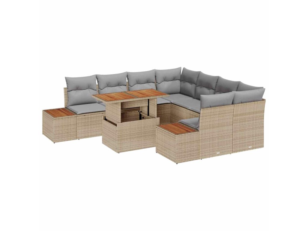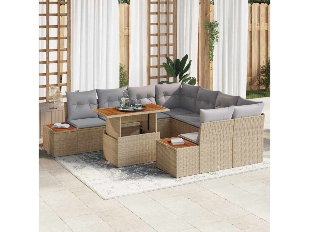 Kvalitné materiály Sada obsahuje robustnú kombináciu ocele s práškovou úpravou a masívneho akáciového dreva, ponúkajúcu odolnú konštrukciu, ktorá odoláva poveternostným podmienkam pri poskytovaní moderného a sofistikovaného vzhľadu. Poly ratanový výplet pridáva prirodzenú textúru a je odolný voči UV žiareniu, čím je ideálny na dlhodobé vonkajšie používanie. Táto kombinácia materiálov zabezpečuje vizuálne príťažlivý a funkčný produkt, ktorý vylepšuje akýkoľvek záhradný priestor.,Funkčné komponenty Zariadené dvoma bočnými pohovkami, dvoma rohovými sedadlami a štyrmi strednými sedadlami, pričom každé z nich zahŕňa funkcie úložiska, táto súprava pohodlne poskytuje úsporné sedenie. Ergonomické opierky chrbta, sedadlové podložky a úchyty zabezpečujú pohodlie pri dlhodobom používaní, zatiaľ čo odnímateľné poťahy vankúšov pridávajú praktickosť pre čistenie a údržbu.,Funkcie Modulárne dizajnové prvky umožňujú konfigurovať súpravu podľa vašich špecifických potrieb a preferencií, čím robia tento nábytok adaptabilnou voľbou pre rôzne príležitosti. Nastaviteľné nožičky tiež zabezpečujú stabilitu na nerovných povrchov, čo zvyšuje celkovú užitočnosť súpravy. Táto flexibilita ju robí odporúčaným prírastkom do akéhokoľvek dynamického vonkajšieho prostredia.,Všestranné využitie Ideálne navrhnuté pre vonkajšie scénáre, táto jedálenská súprava sa bez námahy zmestí na záhradné terasy a pavúky, pričom poskytuje centrálny bod pre letné a jarné zábavy. Jej viacero možnosti sedenia ponúkajú variabilitu pre spoločenské podujatia alebo tichý odpočinok, čím robí tento nábytok vhodnou voľbou pre rôzne vonkajšie nastavenia a príležitosti.,Starostlivosť a údržba Je dôležité použiť obal na ochranu, keď sa nepoužíva, aby váš nábytok zachoval svoje krásne stavy dlhé roky. Pravidelná starostlivosť s jednoduchými obalmi pomáha udržiavať odolnosť a vzhľad aj pod najtvrdšími vonkajšími podmienkami. Táto praktická požiadavka na údržbu zabezpečuje, že vaša jedálenská súprava zostane rovnako pozývajúca a funkčná ako v deň, keď prišla.- Farba: Béžová a šedá