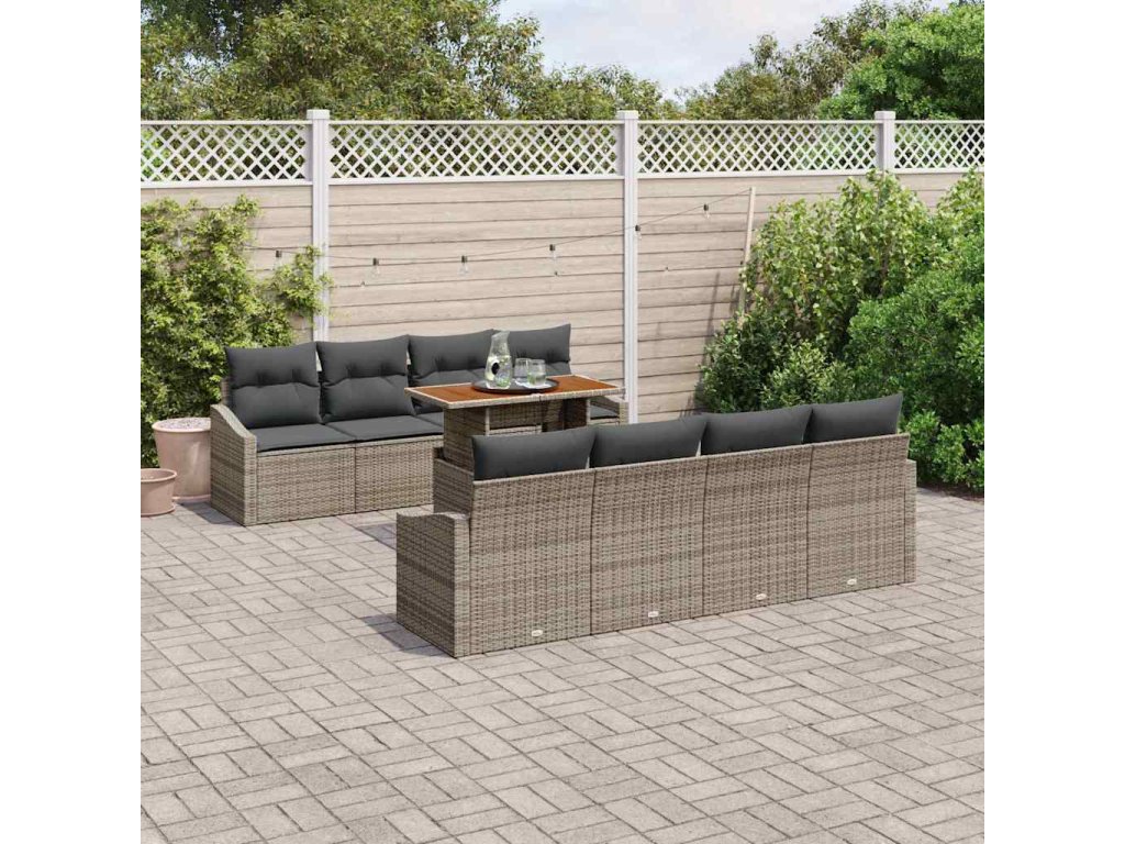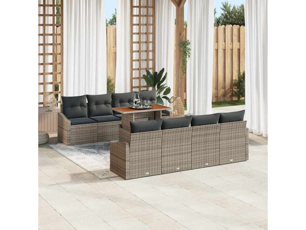 - Odolná konštrukcia: Vyrobený z poly ratanu, práškovo lakovanej ocele a masívneho akáciového dreva, tento jedálenský set spája štýl s odolnosťou. Zatiaľ čo poly ratan poskytuje odolnosť voči vode a UV žiareniu, práškovo lakovaná oceľ zaručuje stabilitu, podporujúc celkovú integritu súboru. Akáciové drevo zvyšuje celkovú estetiku, zobrazujúc harmonickú rovnováhu prírody v leštenom ráme.