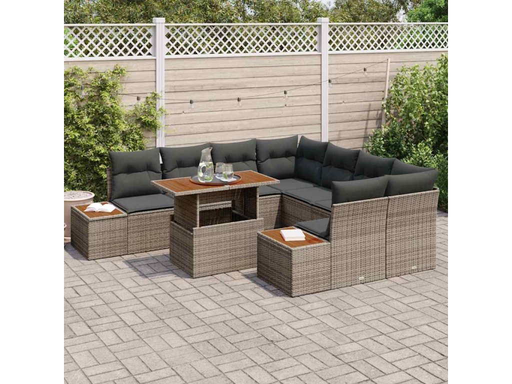 Kvalitné materiály Sada obsahuje robustnú kombináciu ocele s práškovou úpravou a masívneho akáciového dreva, ponúkajúcu odolnú konštrukciu, ktorá odoláva poveternostným podmienkam pri poskytovaní moderného a sofistikovaného vzhľadu. Poly ratanový výplet pridáva prirodzenú textúru a je odolný voči UV žiareniu, čím je ideálny na dlhodobé vonkajšie používanie. Táto kombinácia materiálov zabezpečuje vizuálne príťažlivý a funkčný produkt, ktorý vylepšuje akýkoľvek záhradný priestor.,Funkčné komponenty Zariadené dvoma bočnými pohovkami, dvoma rohovými sedadlami a štyrmi strednými sedadlami, pričom každé z nich zahŕňa funkcie úložiska, táto súprava pohodlne poskytuje úsporné sedenie. Ergonomické opierky chrbta, sedadlové podložky a úchyty zabezpečujú pohodlie pri dlhodobom používaní, zatiaľ čo odnímateľné poťahy vankúšov pridávajú praktickosť pre čistenie a údržbu.,Funkcie Modulárne dizajnové prvky umožňujú konfigurovať súpravu podľa vašich špecifických potrieb a preferencií, čím robia tento nábytok adaptabilnou voľbou pre rôzne príležitosti. Nastaviteľné nožičky tiež zabezpečujú stabilitu na nerovných povrchov, čo zvyšuje celkovú užitočnosť súpravy. Táto flexibilita ju robí odporúčaným prírastkom do akéhokoľvek dynamického vonkajšieho prostredia.,Všestranné využitie Ideálne navrhnuté pre vonkajšie scénáre, táto jedálenská súprava sa bez námahy zmestí na záhradné terasy a pavúky, pričom poskytuje centrálny bod pre letné a jarné zábavy. Jej viacero možnosti sedenia ponúkajú variabilitu pre spoločenské podujatia alebo tichý odpočinok, čím robí tento nábytok vhodnou voľbou pre rôzne vonkajšie nastavenia a príležitosti.,Starostlivosť a údržba Je dôležité použiť obal na ochranu, keď sa nepoužíva, aby váš nábytok zachoval svoje krásne stavy dlhé roky. Pravidelná starostlivosť s jednoduchými obalmi pomáha udržiavať odolnosť a vzhľad aj pod najtvrdšími vonkajšími podmienkami. Táto praktická požiadavka na údržbu zabezpečuje, že vaša jedálenská súprava zostane rovnako pozývajúca a funkčná ako v deň, keď prišla.- Farba: Sivá a hnedá