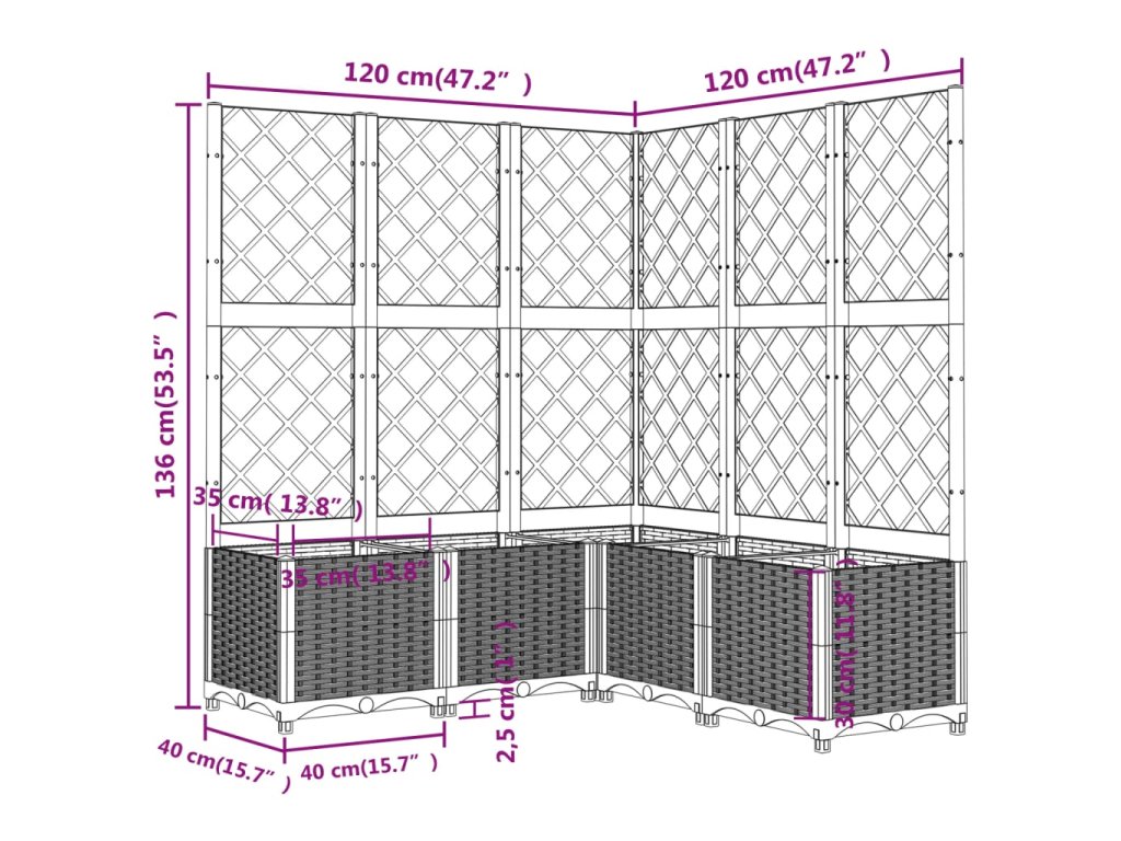 Tento kvetináč je vyrobený z PP odolného voči poveternostným vplyvom, je pevný a vhodný na vonkajšie použitie. Do spodného boxu sa zmestí veľké množstvo zelených rastlín a kvetov. Integrovaná mriežka ponúka skvelú podporu pre pestovanie popínavých rastlín, ako sú paradajky, hrach a ruže.