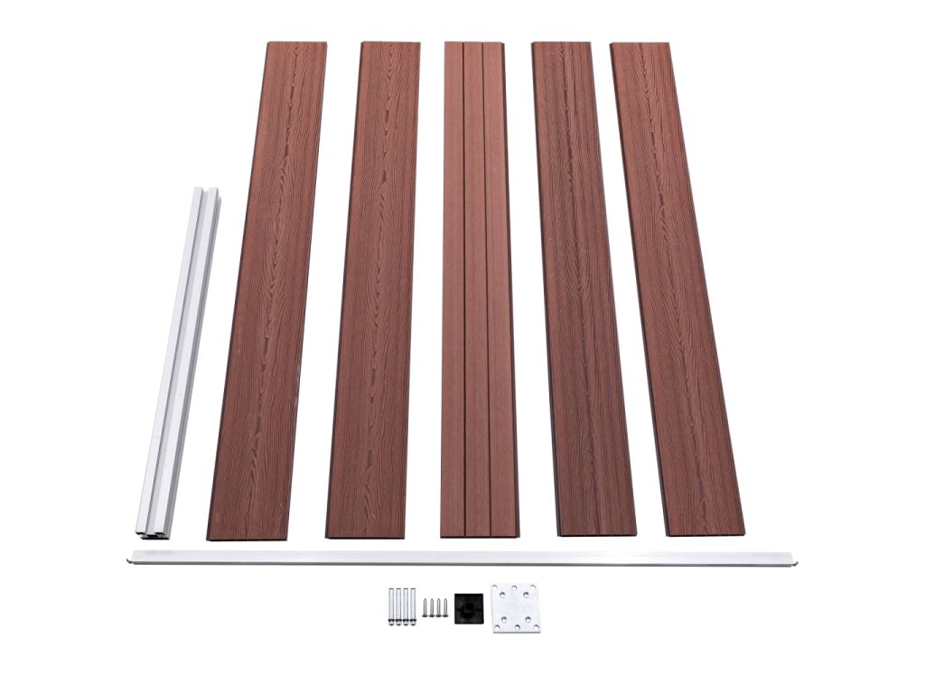 V balení sa nachádza 9 dosiek z WPC, 1 stĺpik, 1 oceľový podstavec a 1 hliníková tyč.