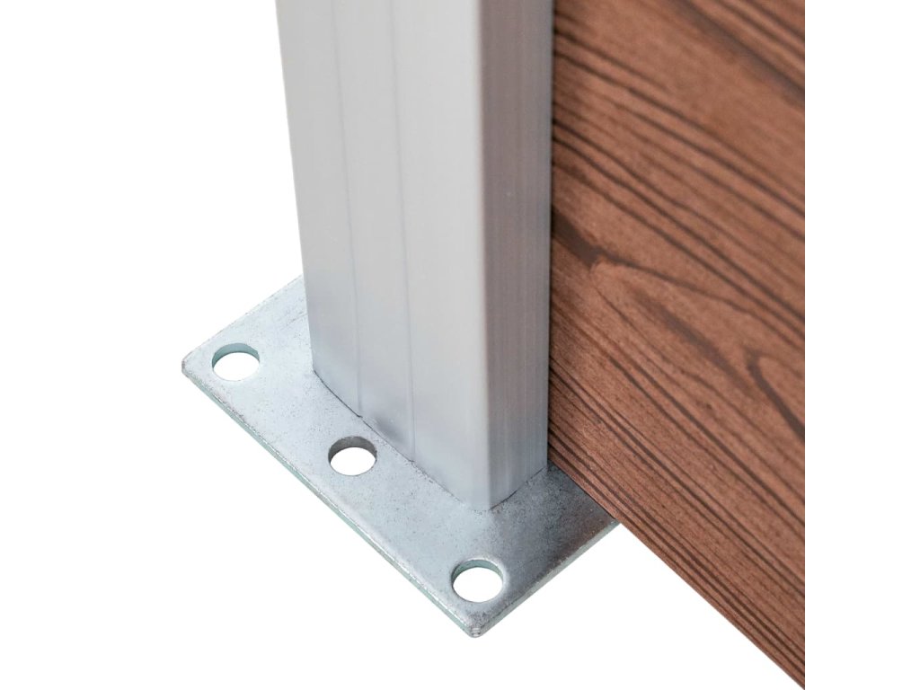 Plot z WPC má na jednej strane potlač dreva a na druhej strane potlač s pravidelným vzorom, takže si môžete vybrať ten dizajn, ktorý sa vám viac páči. Náš drevoplastový panel si nevyžaduje žiadnu ďalšiu úpravu, ako napríklad olejovanie alebo natieranie. Je veľmi trvácny a odolný voči hnilobe alebo hrdzi. Vďaka hliníkovému hornému profilu sa môžu plotové dosky k sebe tesne pripojiť, čo zvyšuje ich pevnosť a odolnosť voči nárazu. Plotové dosky s modulárnym dizajnom sa jednoducho montujú a umožnia vám plot v prípade potreby rozšíriť. Stĺpiky majú tri otvory, aby ste plot mohli zostaviť rôznymi spôsobmi, napríklad v priamej línii (180°), do pravého uhla (90°) alebo do tvaru písmena T. Multifunkčné oceľové nohy sa dajú upevniť dvoma spôsobmi. Prvým z nich je priskrutkovanie nohy k povrchu pomocou kotviacich skrutiek, ktoré sú súčasťou balenia. Druhým spôsobom je zakotvenie nohy do cementovej základne pomocou uzemňovacieho hrotu (nie je súčasťou balenia). Táto plotová sada sa jednoducho montuje.