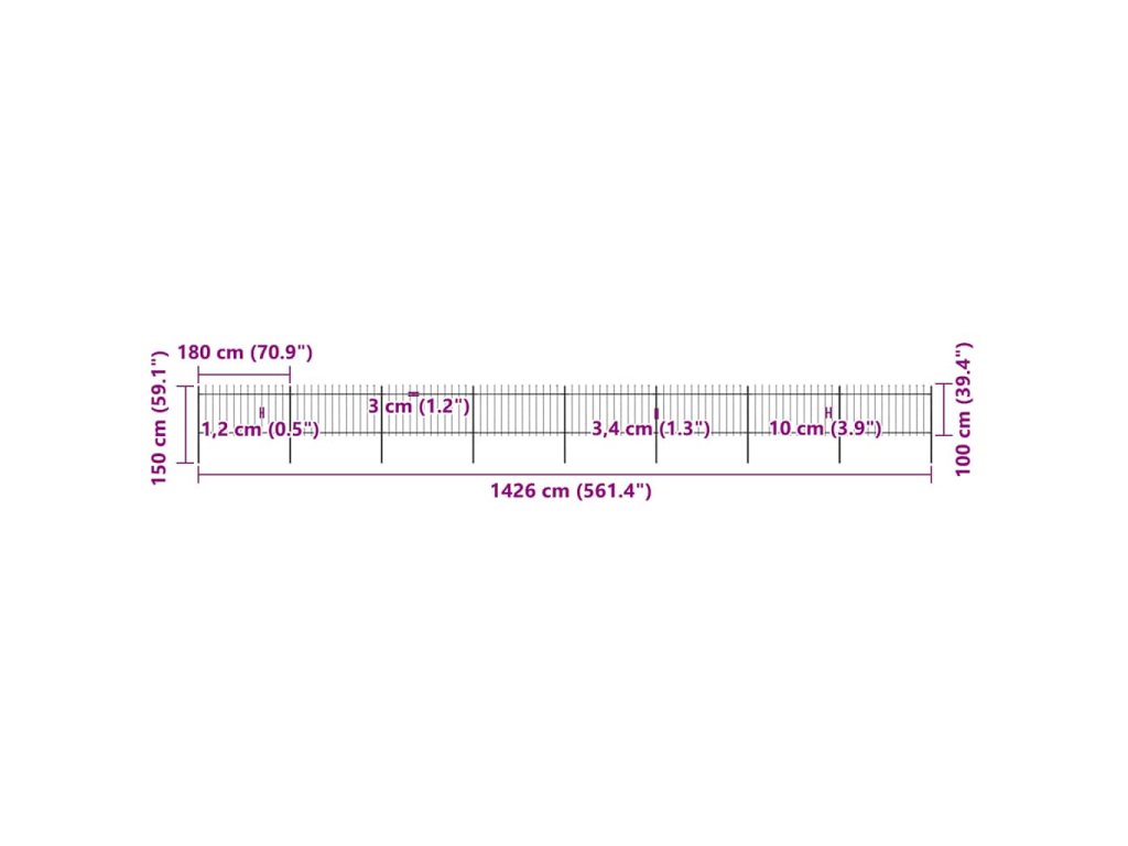 Vytvorte si okolo svojej záhrady, domu či chodníka elegantné oplotenie s našim záhradným plotom! Ozdobný oceľový záhradný plot pozostáva z 8 plotových panelov a 9 stĺpikov a má celkovú dĺžku 13,6 metra. Umožní vám postaviť si robustnú a bezpečnú bariéru, ktorá si nevyžaduje žiadnu údržbu a ktorá ohraničí vašu záhradu, dom či komerčné priestory.