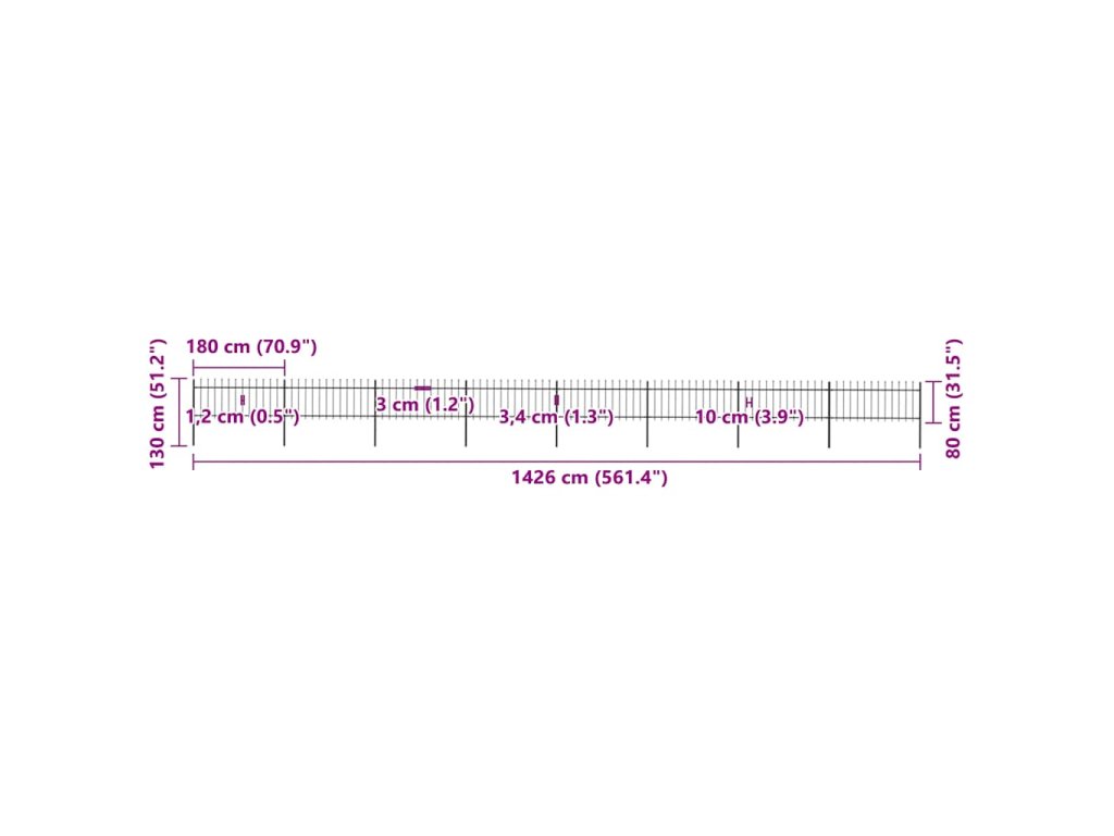 Vytvorte si okolo svojej záhrady, domu či chodníka elegantné oplotenie s našim záhradným plotom! Ozdobný oceľový záhradný plot pozostáva z 8 plotových panelov a 9 stĺpikov a má celkovú dĺžku 13,6 metra. Umožní vám postaviť si robustnú a bezpečnú bariéru, ktorá si nevyžaduje žiadnu údržbu a ktorá ohraničí vašu záhradu, dom či komerčné priestory.