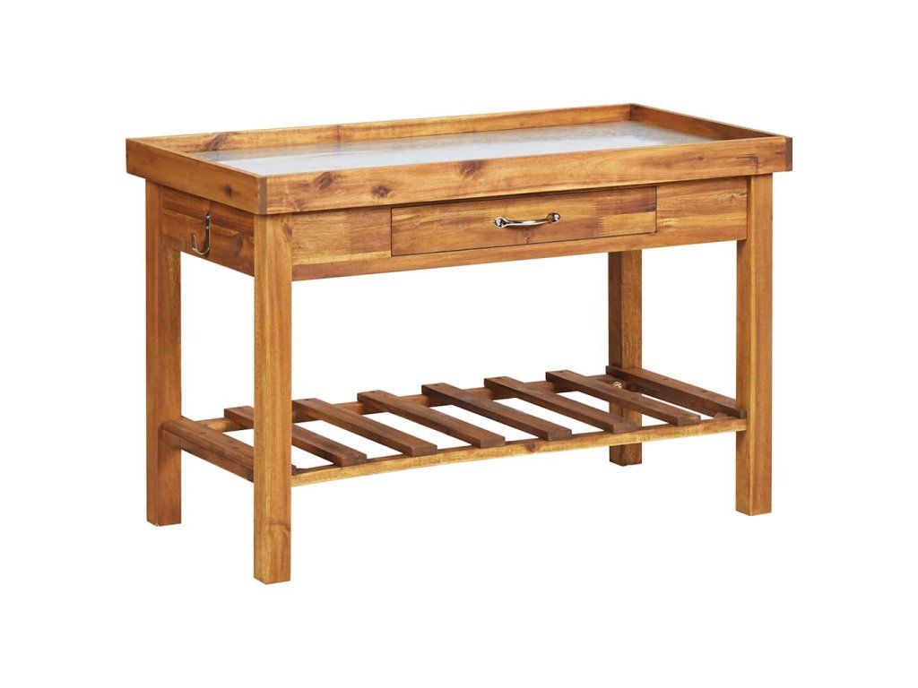Tento záhradný výsadbový stôl je vyrobený z masívneho akáciového dreva so zinkovou pracovnou doskou, ktorá je trvácna a stabilná. Dodáva sa v prírodnom prevedení, ktoré je pripravené na maľovanie alebo morenie. Spodná časť navyše obsahuje odkladaciu poličku, ktorá vám poskytuje dostatok miesta na uloženie pôdy, kvetináčov, ručného náradia, kanvíc a ďalších záhradníckych potrieb.