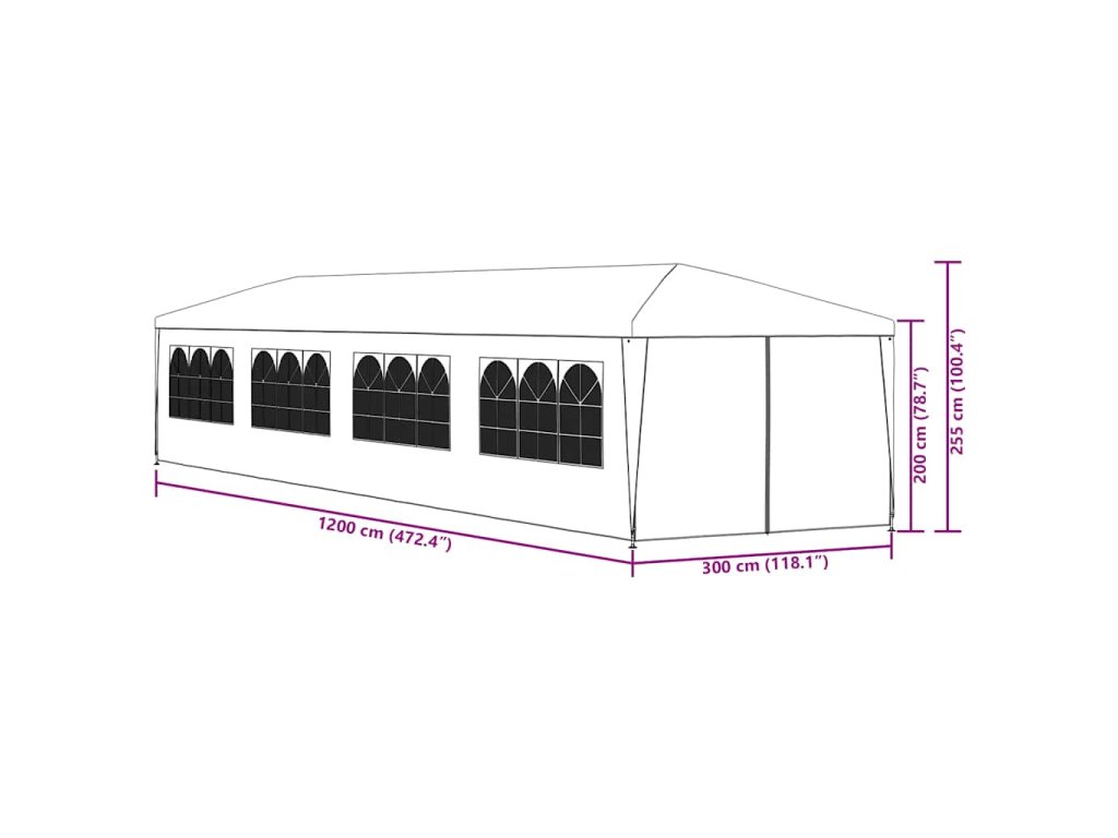 Párty stan je vyrobený zo 100% polyetylénového materiálu, takže je vodovzdorný a odolný voči UV žiareniu. Stan má 8 odnímateľných bočných panelov, pričom na každom z nich sa nachádzajú dekoratívne okná, a 2 panely s dverami na zips, ktoré umožňujú jednoduchý vstup. Rám je vyrobený z ocele odolnej voči hrdzi, takže je skutočne trvácny. Montáž je jednoduchá.