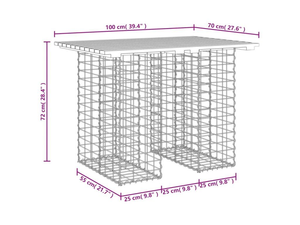 - Pevná a stabilná základňa: Tento vonkajší stôl má základňu z pozinkovaného oceľového gabionového koša, ktorá je navrhnutá tak, aby sa dala naplniť kameňmi a štrkom pre ešte väčšiu krásu. Pletivo gabionového koša je v každom priesečníku zvarené priečnymi a pozdĺžnymi drôtmi pre väčšiu stabilitu.