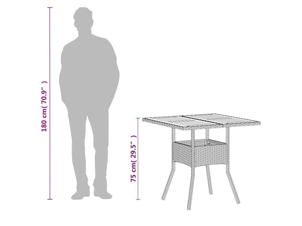 - Materiál: PE (polyetylén) ratan, oceľ s práškovou povrchovou úpravou, akáciový masív s prírodným olejovým náterom