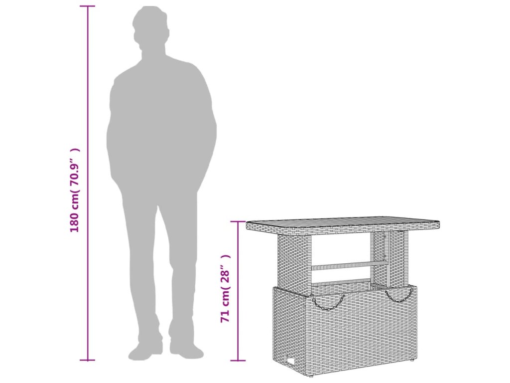 - Nastaviteľná stolová doska: Stolová doska sa dá zdvihnúť, aby bol stôl vyšší, čím sa vonkajší stôl zmení z konferenčného na jedálenský. Je ideálny na pozvanie hostí alebo jedenie vonku.