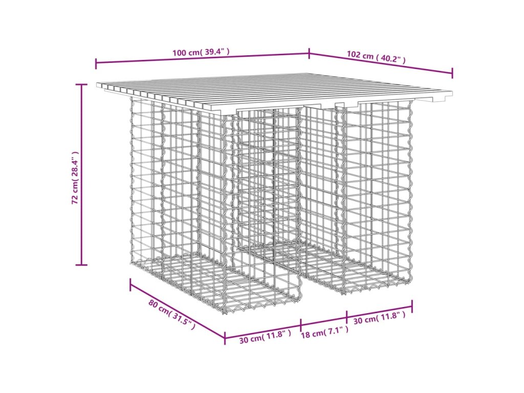 - Pevná a stabilná základňa: Tento vonkajší stôl má základňu z pozinkovaného oceľového gabionového koša, ktorý je navrhnutý tak, aby sa dal naplniť kameňmi a štrkom pre ešte väčšiu krásu. Pletivo gabionového koša je v každom priesečníku zvarené priečnymi a pozdĺžnymi drôtmi pre väčšiu stabilitu.