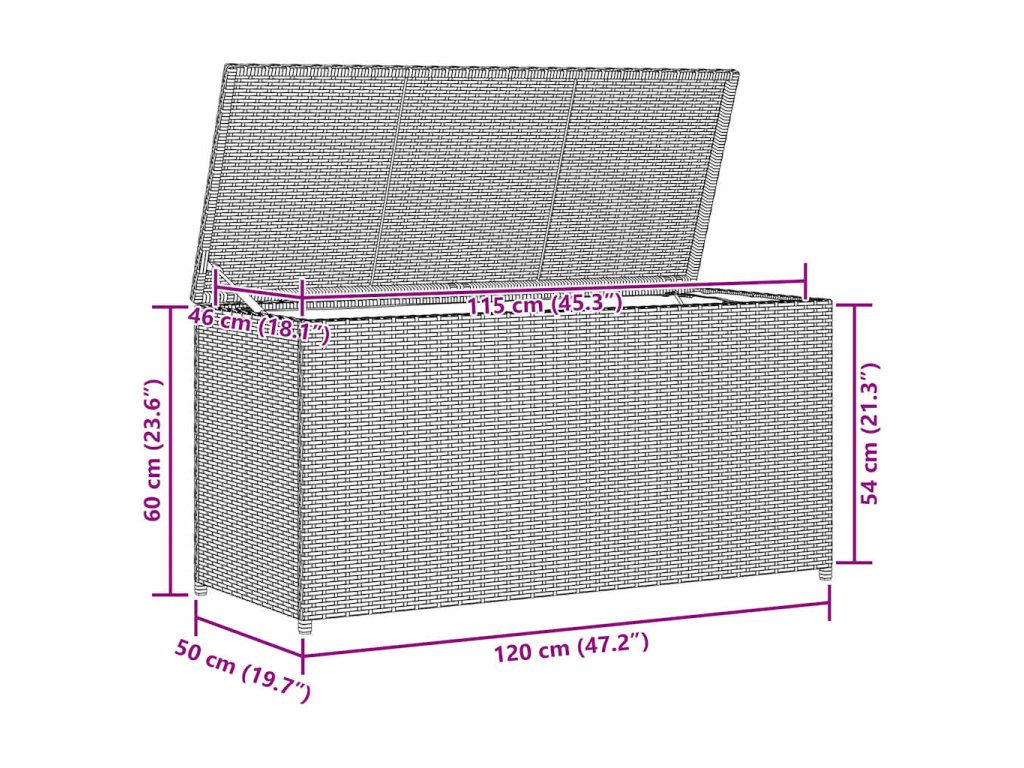 - Materiál: Oceľový rám s práškovou povrchovou úpravou + povrch z PE ratanu + veko z polykarbonátovej dosky