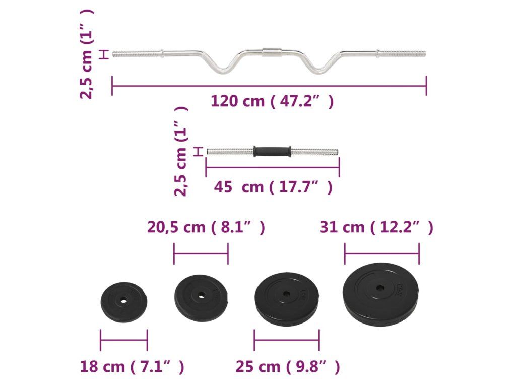 - Rozmery tyče na činku barbell (ohnutá): 25 mm x 120 cm (Priemer x D)