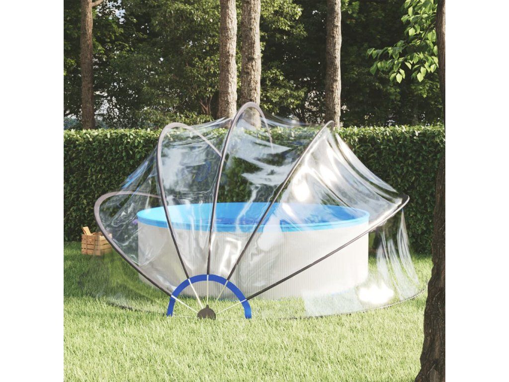 Kryt na bazén je vyrobený z PVC s UPF 30 a má konštrukciu zo sklolaminátu. Poskytne vám vynikajúcu ochranu pred slnkom a dažďom. Postará sa o to, aby sa do bazéna nedostalo lístie, hmyz, prach a ďalšie nečistoty z vonka. V prípade potreby dokáže zabezpečiť rýchlejší ohrev vody a menší únik tepla v priebehu noci. Prístrešok sa ľahko otvára vďaka jedinečnému mechanizmu s pántmi. Kryt je priehľadný, a tak vám neunikne žiadne dianie okolo bazéna. Zastrešenie bazénu sa dodáva spolu s hrotmi a hákovými klincami do zeme, pomocou ktorých ho môžete pevne ukotviť k zemi. A tak sa nemusíte obávať, že vietor toto zastrešenie bazénu odfúkne.