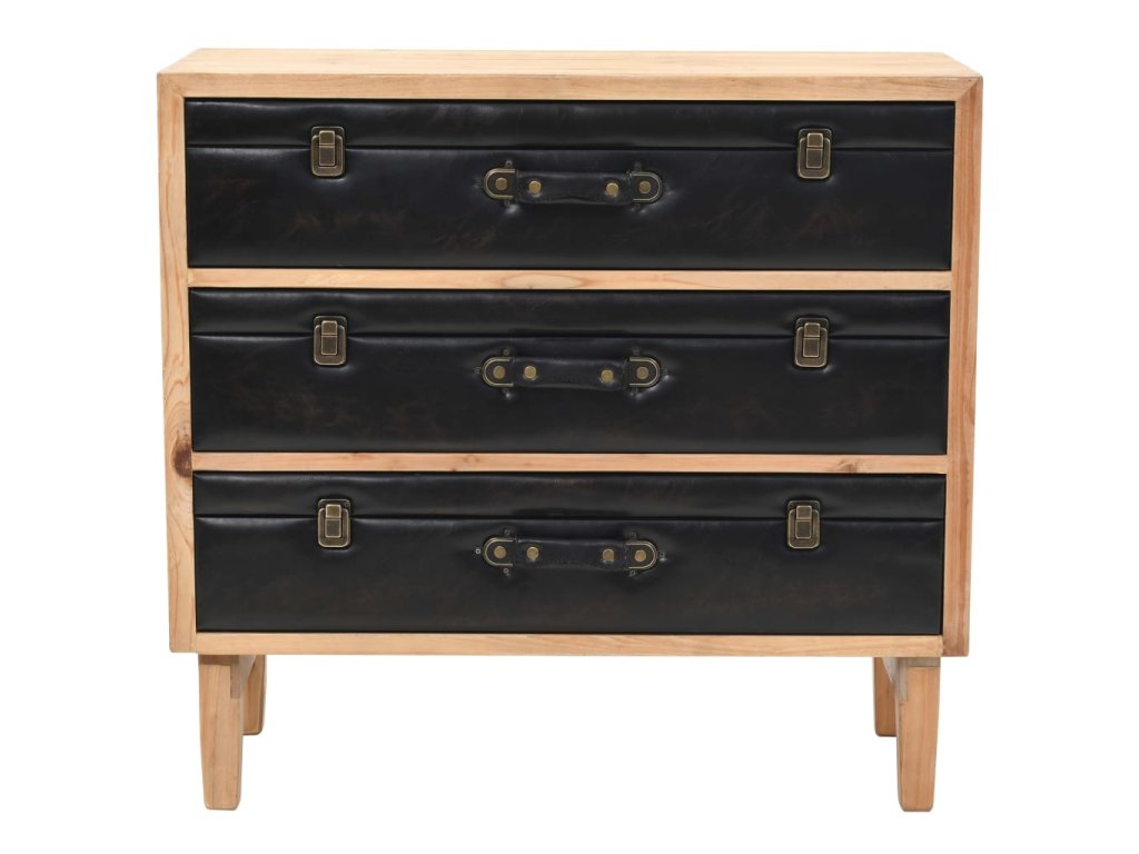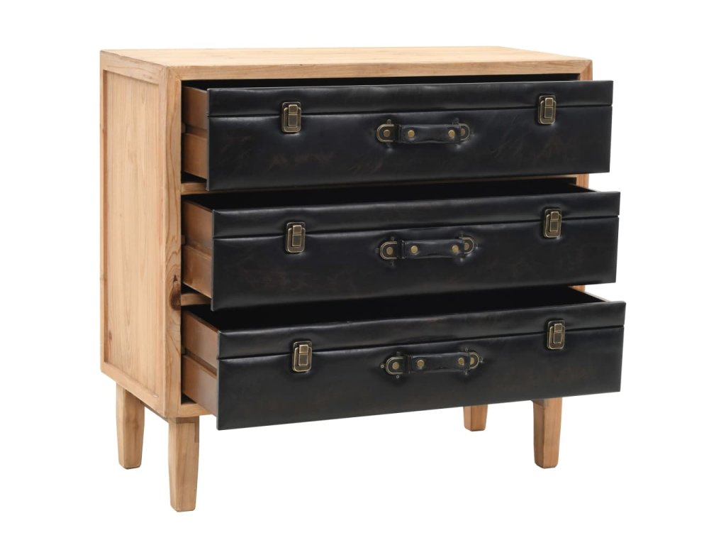 Táto drevená retro skrinka má zásuvky, ktorých predná časť pripomína kufre, a tak predstavuje krásny ozdobný doplnok do spálne či obývačky.