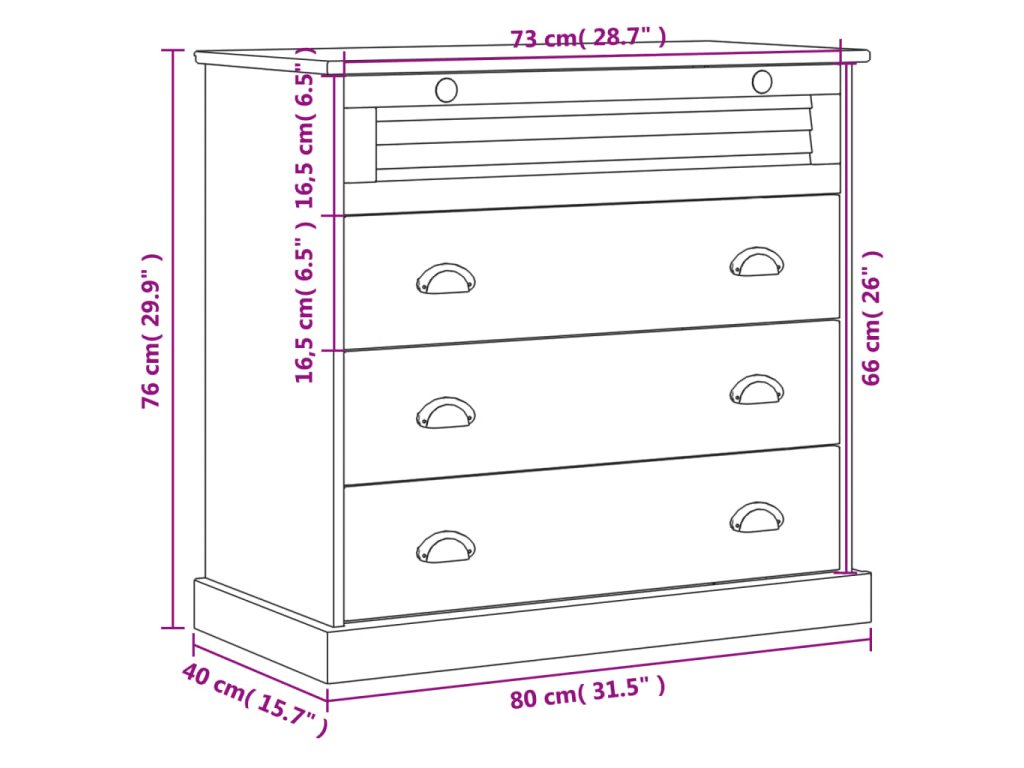 - Kovové rukoväte a gombíky: Skriňa so zásuvkami je vybavená kovovými úchytkami a gombíkmi, ktoré uľahčujú otváranie a zatváranie skrine a zároveň jej pridávajú na kráse.