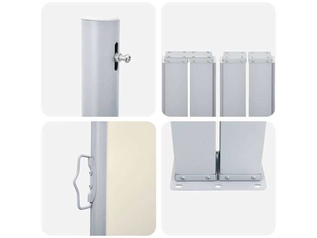 Zástena je vyrobená z polyesteru, ktorý sa netrhá, je vodovzdorný a odolný voči UV žiareniu. Kazeta, z ktorej zaťahovaciu markízu jednoducho vytiahnete von, je osadená v zvislej polohe na pevnej oceľovej základni. Markíza je navyše vybavená funkciou automatického zrolovania. Súčasťou balenia je aj montážne príslušenstvo.