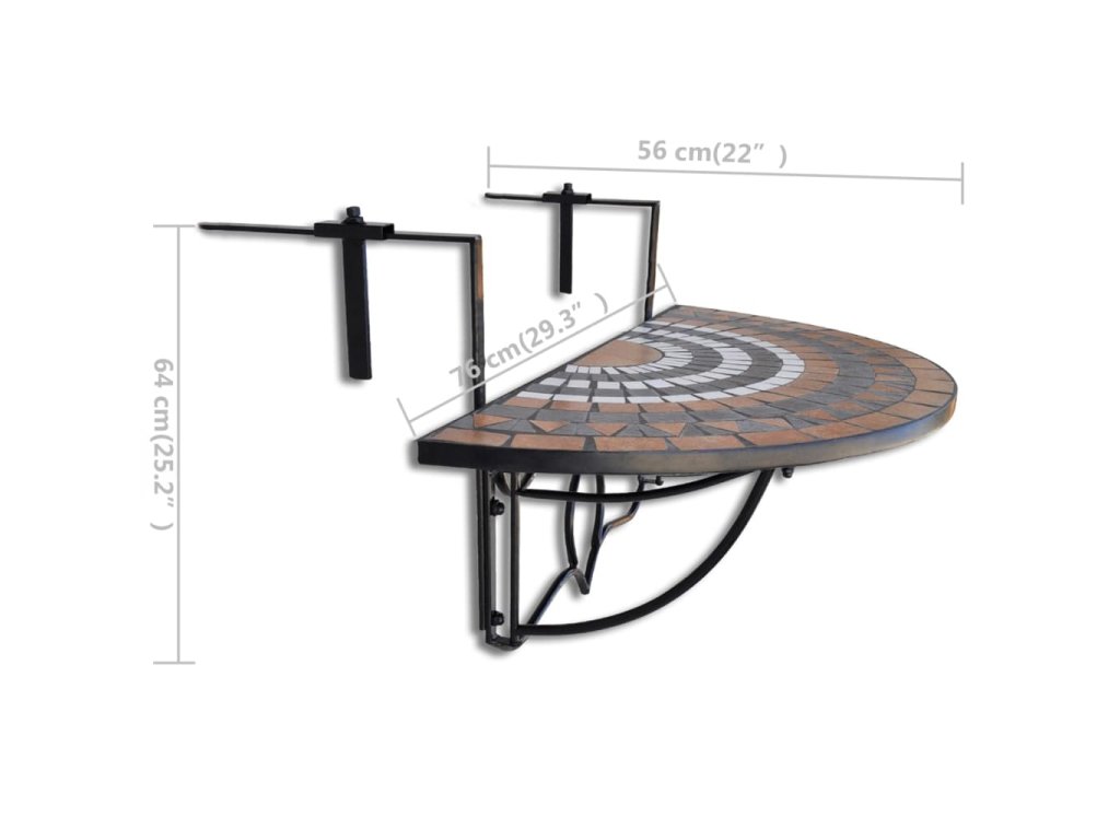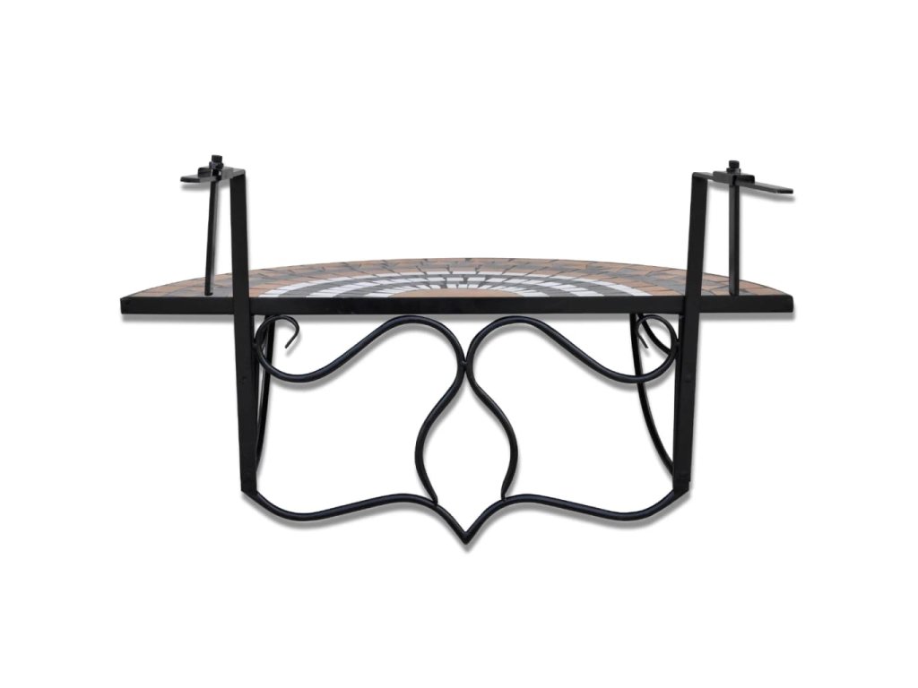 Železný rám stolíku dodáva potrebnú pevnosť a keramická doska v tvare polkruhu sa dá jednoducho očistiť. Stolík na balkón sa dá namontovať na akúkoľvek terasu či balkón so zábradlím so šírkou do 18 cm. Dá sa jednoducho sklopiť, keď sa nepoužíva, aby nezaberal veľa miesta. Upozorňujeme, že nie je vhodné výrobok nechávať vonku v chladnom počasí.