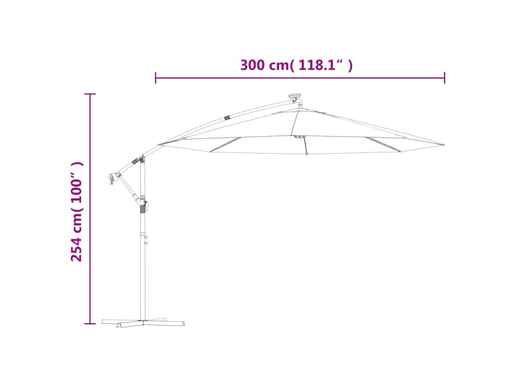 Slnečník je vyrobený z polyesteru, ktorý nevybledne a je odolný voči UV žiareniu, vďaka čomu vám poskytne optimálnu ochranu pred slnkom a ľahko sa čistí. Je vybavený 24 solárnymi LED diódami, ktoré automaticky osvetlia vaše vonkajšie priestory a po zotmení vytvoria vo vašej záhrade príjemnú a romantickú atmosféru. Dodáva sa s pevným podstavcom v tvare kríža pre lepšiu stabilitu. Exkluzívny dizajn vám umožní slnečník podľa potreby nakloniť, aby zatienil aj zapadajúce slnko. Pevná oceľová tyč spolu s 8 trvácnymi rebrami zabezpečujú výbornú stabilitu a dlhú životnosť slnečníka. Tento záhradný slnečník sa dá jednoducho otvárať a zatvárať pomocou kľukového mechanizmu.
