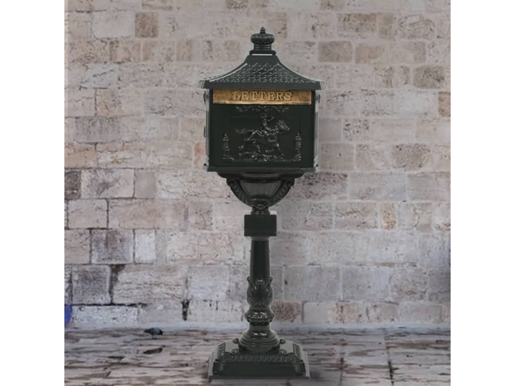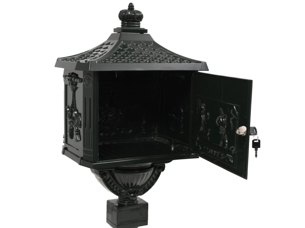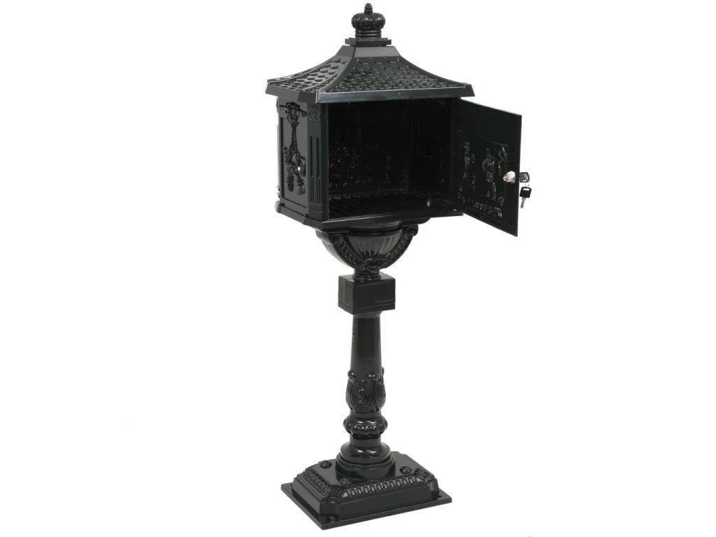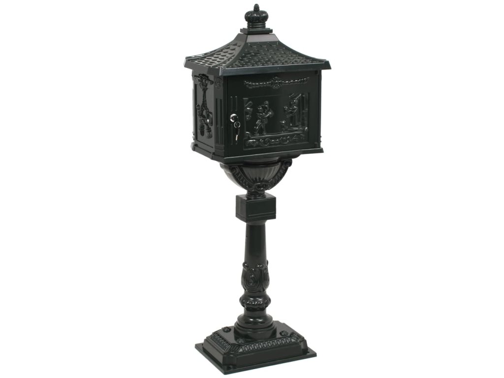 Táto stĺpová poštová schránka je navrhnutá so širokým priečinkom, ktorý má klapku pre ochránenie obsahu vo vnútri. Taktiež má uzamykateľné dvierka (pre každé dvierka sú pribalené 2 kľúče) na jednoduché vytiahnutie pošty. Poštová schránka je vyrobená z liateho hliníka odolného voči vplyvom počasia a hrdzi, vďaka čomu ju veľmi vhodná pre vonkajšie použitie. Je ozdobená množstvom nádherných dekoratívnych detailov vo vintage štýle a bude pútať pozornosť na vašej príjazdovej ceste alebo vchode.