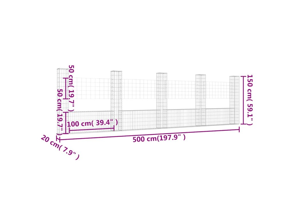 Multidom Železný gabiónový kôš v tvare U s 5 stĺpmi 500x20x150 cm