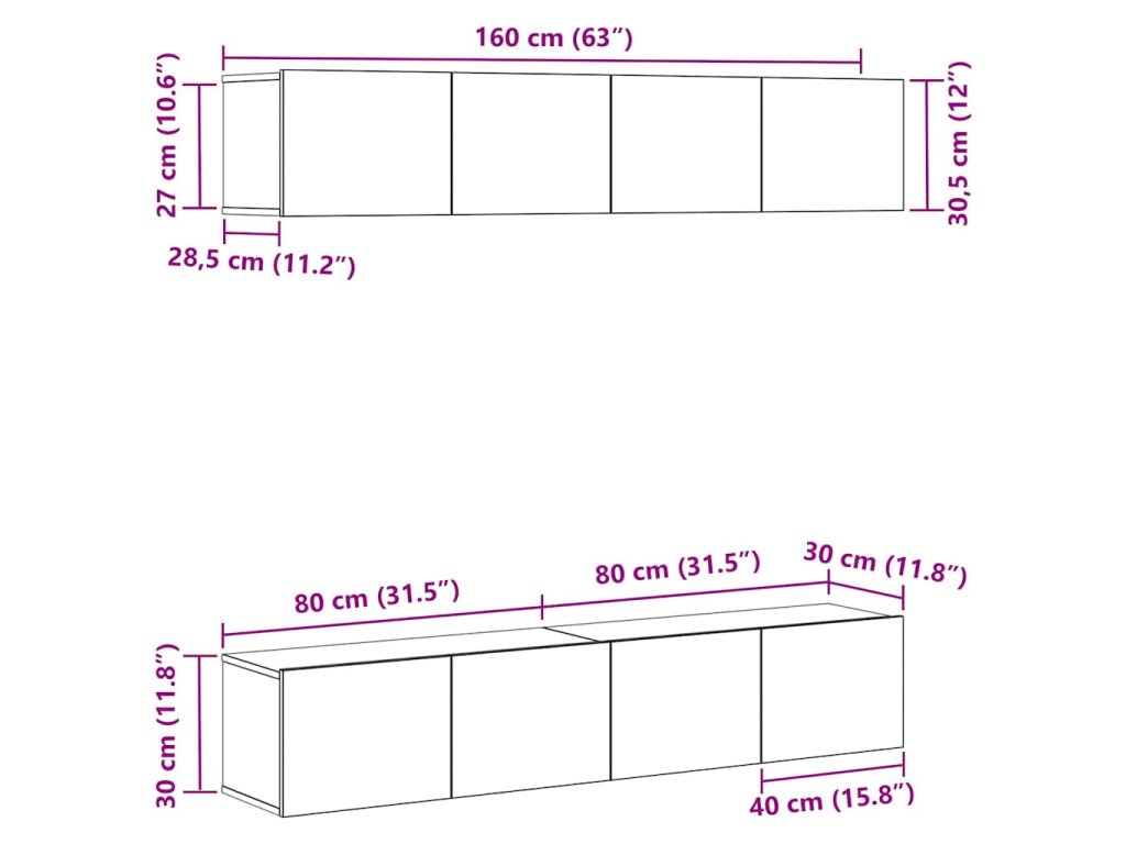 Tento set nástenných TV skriniek je kombináciou štýlu a funkčnosti. S modernou obdĺžnikovou siluetou dodáva každej obývačke elegantný a súčasný šmrnc, pričom uvoľňuje cenný podlahový priestor. Úsporný dizajn skrinky je ideálny na organizovanie a skladovanie rôznych vecí a zároveň zlepšuje celkový vzhľad izby. Hodí sa pre priestranné aj menšie priestory, poskytuje estetický dotyk a maximalizuje využitie dostupného miesta.