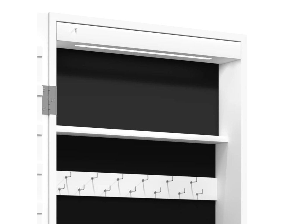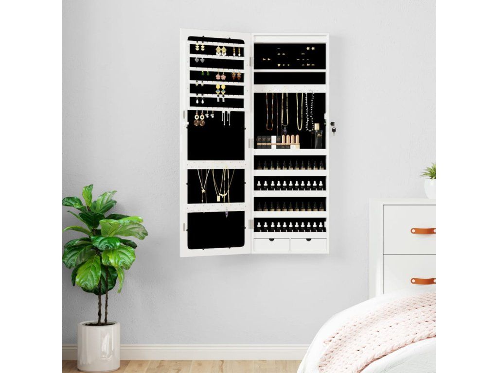- Priestorovo úsporný dizajn: Zaveste zrkadlovú šperkovnicu na dvere pomocou priložených háčikov alebo ju pripevnite na stenu, aby ste ušetrili miesto na podlahe.