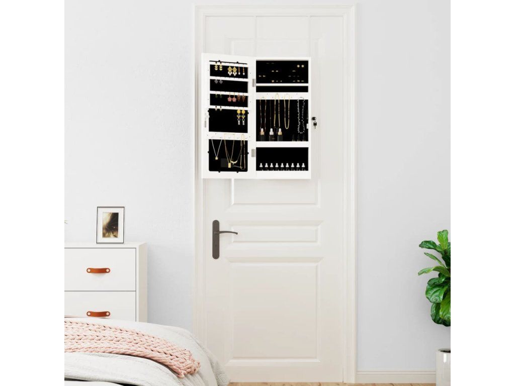 - Priestorovo úsporný dizajn: Zaveste zrkadlovú šperkovnicu na dvere pomocou priložených háčikov alebo ju pripevnite na stenu, aby ste ušetrili miesto na podlahe.