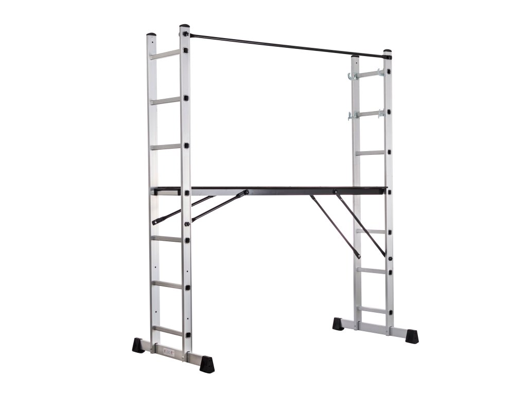 Multifunkčné lešenie G21 Handrail má rôzne kombinácie využitia. Môžete ho použiť ako samostatný rebrík s rôznymi dĺžkami, rebrík a lešenie (s veľkosťou plošiny 159 x 40 cm), ktorý má 2 stabilné oporné nohy.