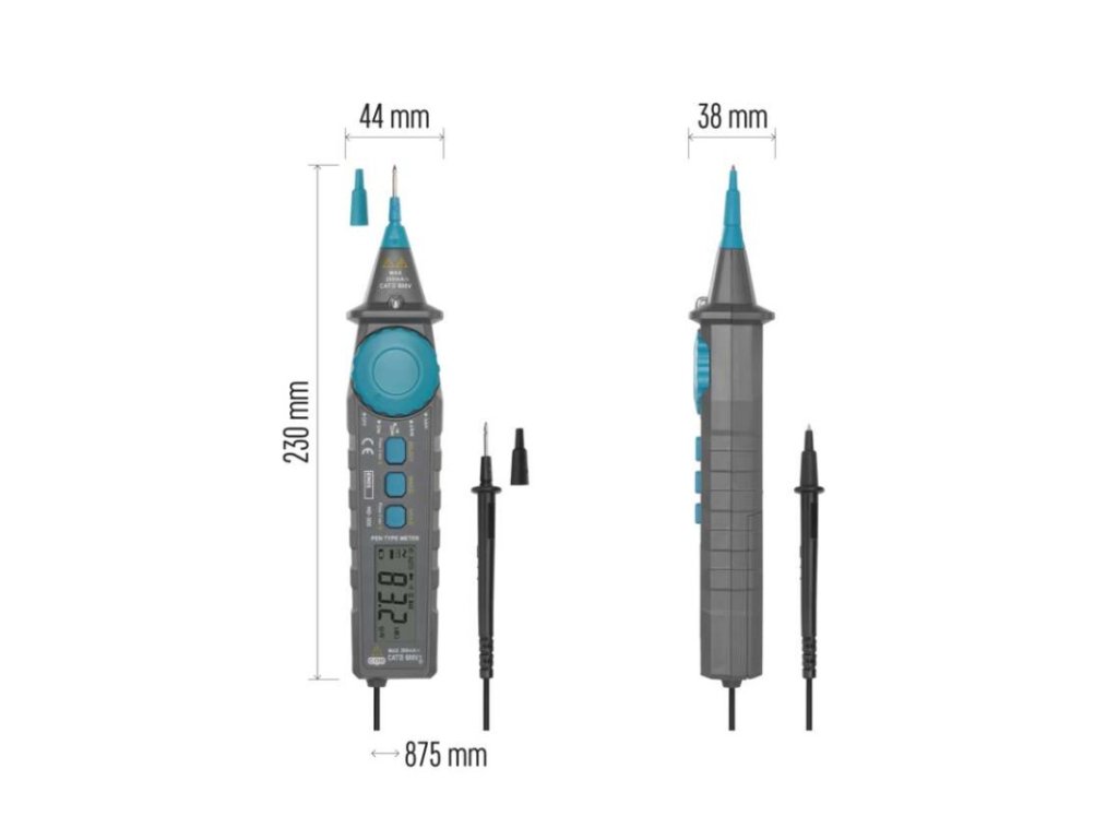 AC napätie: 2–600 V|AC prúd: 200 µA – 200 mA|automatické vypnutie: áno|bezkontaktná detekcia AC napätia: nie|DC napätie: 200 mV – 600 V|DC prúd: 200 µA – 200 mA|elektrický odpor: 200 Ohm – 20 MOhm|indikácia slabej batérie: áno|kliešťový multimeter: nie|kontaktná detekcia AC napätia: nie|meranie teploty: nie|napájanie: 2× 1,5 V AAA (súčasťou balenia)|podsvietenie displeja: áno|predajný obal: 1 ks, blister|rozmer: 44 × 38 × 230 mm|spojitosť obvodov: áno|súčasť dodávky: batéria, návod, meracie hroty|test batérií: nie|test diód: áno|test tranzistorov: nie|voľba rozsahu: automatická|záznam max. hodnoty: áno|záznam nameranej hodnoty: áno|zobrazenie displeja: 3 1/2 digitDodatočné parametre