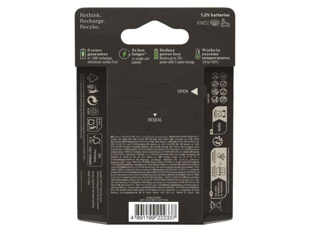 chemické zloženie: NiMH|hmotnosť: 30 g|kapacita: 2 000 mAh|kategória/rada: ReCyko Pro|max. skladovateľnosť: neuvádza sa|možnosť nabíjania: áno|napätie: 1,2 V|počet nabíjacích cyklov: viac ako 1 500|predajný obal: 6 ks, papierová krabička|prevádzková teplota: -20 °C až +50 °C|rozmer: 14,5 × 50,5 mm|typové označenie: HR6 (tužka, AA)|veľkosť batérie: AA|značka: GPDodatočné parametre