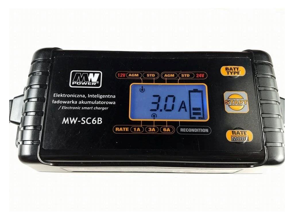 MW POWER nabíjačka olovených a gélových batérií 12V/24V/6AAutomatická nabíjačka určená pre 12V alebo 24V uzavreté, bezúdržbové olovené batérie (batérie VRLA) typu GEL a AGM aj pre automobilové olovené batérie. Maximálny nabíjací prúd je 6A. Nabíjačka je automatická, kontroluje napätie batérie, automaticky volí napätie a nabíjací prúd.