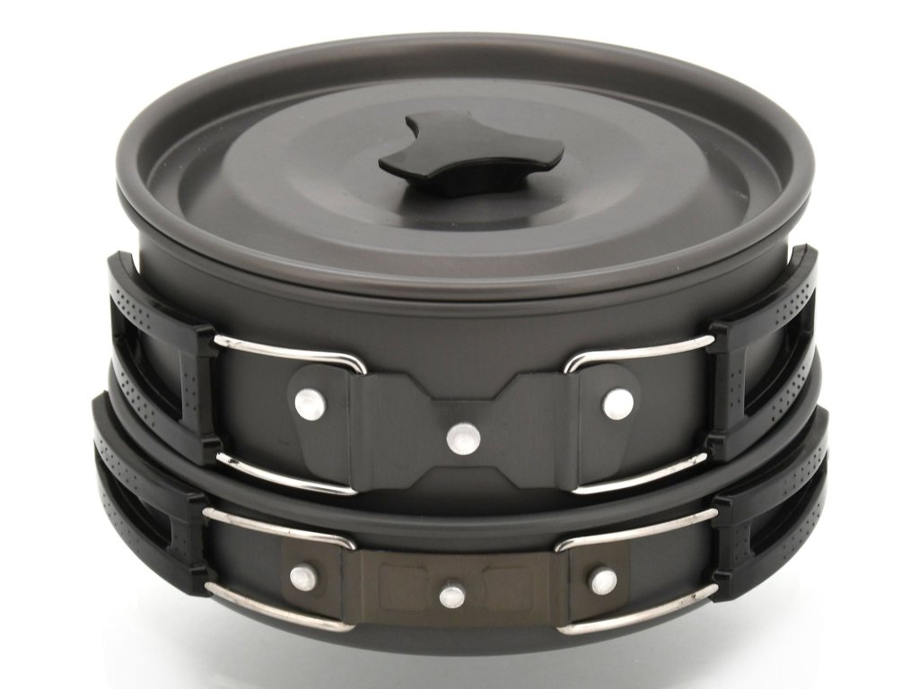 Sada outdoorového nádobí v provedení z anodizovaného hliníku.