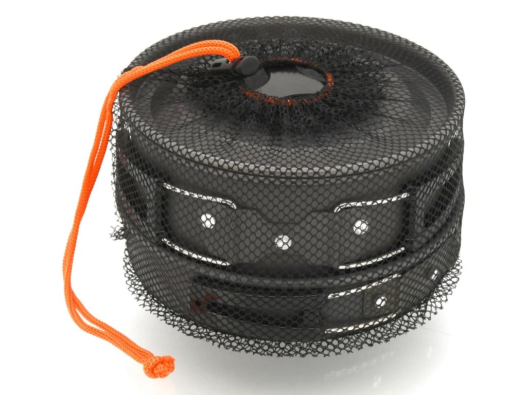 Jednotlivé části sady jsou rozměrově přesně odstupňovány a dají se tak složit dohromady, čímž ušetří spoustu místa. Navíc je vše uloženo v praktické sítěné tašce.