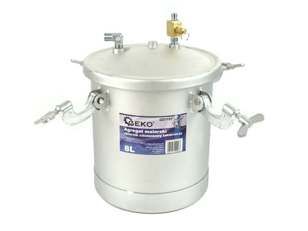 - Atestovaná nádrž o kapacitě 8 l vybavená regulátorem obousměrného vzduchu pro regulaci tlaku uvnitř nádrže, pojistným ventilem, sací hlavicí s 3/8 "konektorem pro připojení hadici k pistoly, odvzdušňovací ventil, rukojeť.