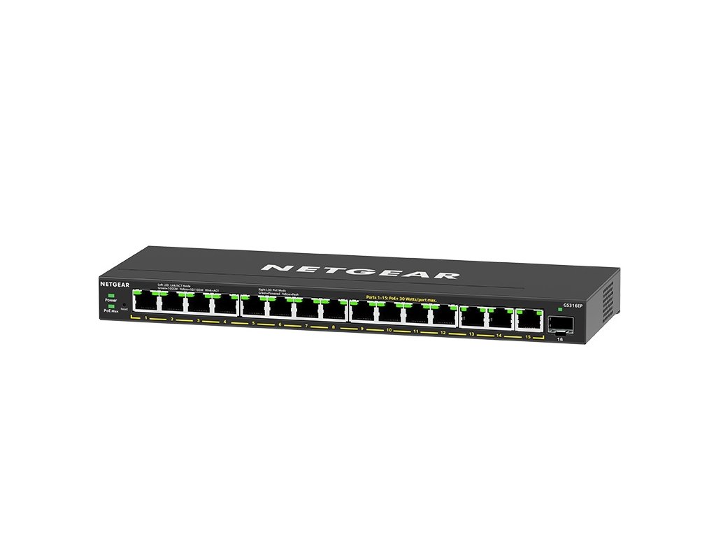 Netgear GS316EP 16portový přepínač PoE+ Gigabit Ethernet Plus (180 W) s 1 portem SFP. NETGEAR 16-portový switch PoE+ Gigabit Ethernet Plus poskytuje základní funkce podnikové sítě a napájí zařízení PoE+, jako jsou telefony VoIP, IP kamery a další. *16 portů poskytuje až 1 000 Mb/s vyhrazené neblokující šířky pásma *15 portů PoE+ poskytuje celkem 180 W energie, takže můžete napájet a připojovat svá zařízení jediným kabelem *Správa priorit PoE, omezení napájení PoE na port, plánování PoE a další pro snadné ovládání všech zařízení napájených PoE *Neblokující přepínání *Design bez ventilátoru *Všestranné možnosti montáže Technické parametry *Porty: 15 x Gigabit Ethernet Plus, 1 x SFP *Celkový počet portů PoE+: 15 *Celkový rozpočet PoE+: 180 W *Nepřerušovaný PoE: Ano *Šířka pásma: 32 Gb/s *Max. počet položek Mac: 4K *Velikost vyrovnávací paměti: 192 kB *Energeticky efektivní ethernet (IEEE 802.3az): Ano *Prioritní řazení: WRR *Podpora rámce Jumbo: 10 000 bajtů *Rozměry: 286 x 102 x 27 mm *Hmotnost: 0,88 kg Odkaz na web výrobce: https://www.netgear.com/business/wired/switches/plus/gs316ep/Dodatočné parametre