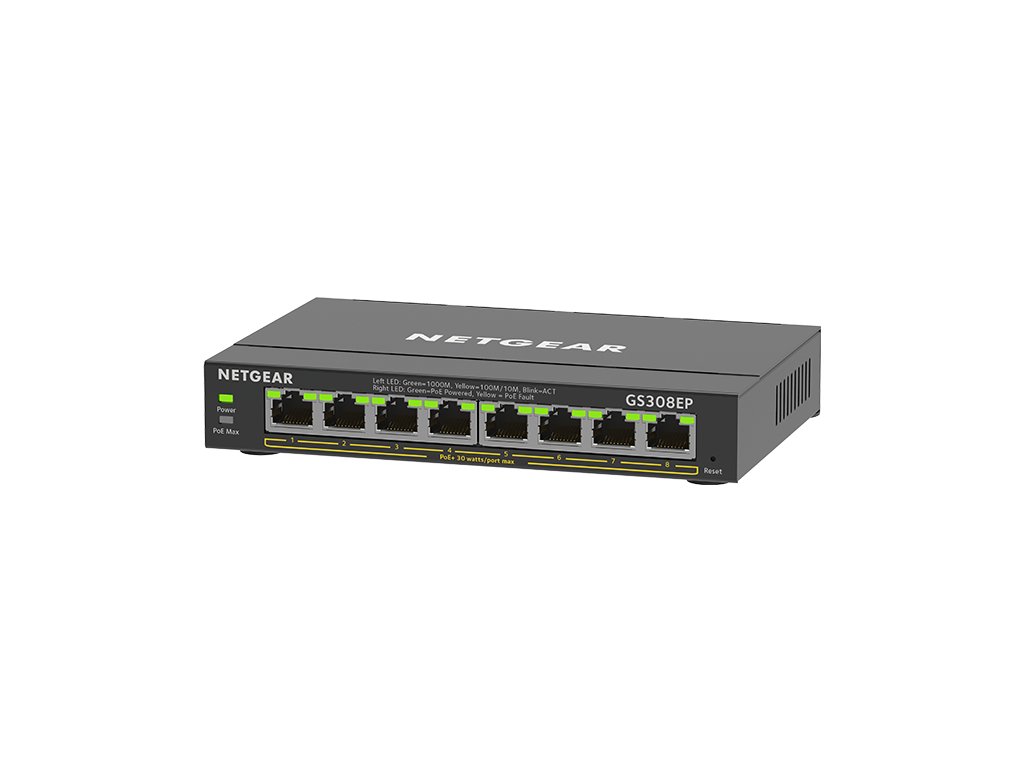 GS308EP-100PES - 8-Portový Gigabit Ethernet PoE+ Plus Switch FUNKCE - Pokročilé ovládací prvky pro optimalizovaný výkon sítě a lepší poskytování kritického provozu, jako je hlas a video - Podpora VLAN pro segmentaci provozu - Zrcadlení portů pro monitorování sítě - Jednoduché nakonfigurování sítě pomocí uživatelsky přívětivého webového grafického rozhraní NETGEAR Smart Managed TECHNICKÉ VLASTNOSTI 10/100/1000 RJ45 měděné porty (Auto Uplink) : 8x Typ konektoru: Kov PoE porty: 8x Nepřerušovaný PoE: Ano Šířka pásma: 16Gbps Max. počet MAC záznamů: 4K Velikost vyrovnávací paměti: 192KB Přednostní řazení do fronty: WRR Jumbo frame: 9 216 bytů MTBF: 859 126 hodin VLAN: 64 Agregace odkazů / propojení portů: Ano IGMP snooping (v1, v2, and v3): Ano Blokovat neznámé vícesměrové vysílání: Ano DHCP klient: Ano Podporované skupiny vícesměrového vysílání: 128 PoE porty: 4x LED: Rychlost, Odkaz, Aktivita, PoE Rozměry (Š x H x V): 158 x 101 x 27 mm Hmotnost: 0,40kg Operační teplota: 0°až 40°C Certifikace: CE, VCCI, ACMA, CSA, KC, BSMI OBSAH BALENÍ - NETGEAR Plus Switch - Napájecí adaptér- Gumové nohy- Sada pro montáž na zeď- Instalační příručkaDodatočné parametre