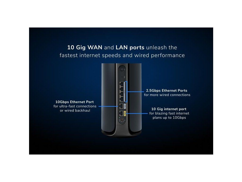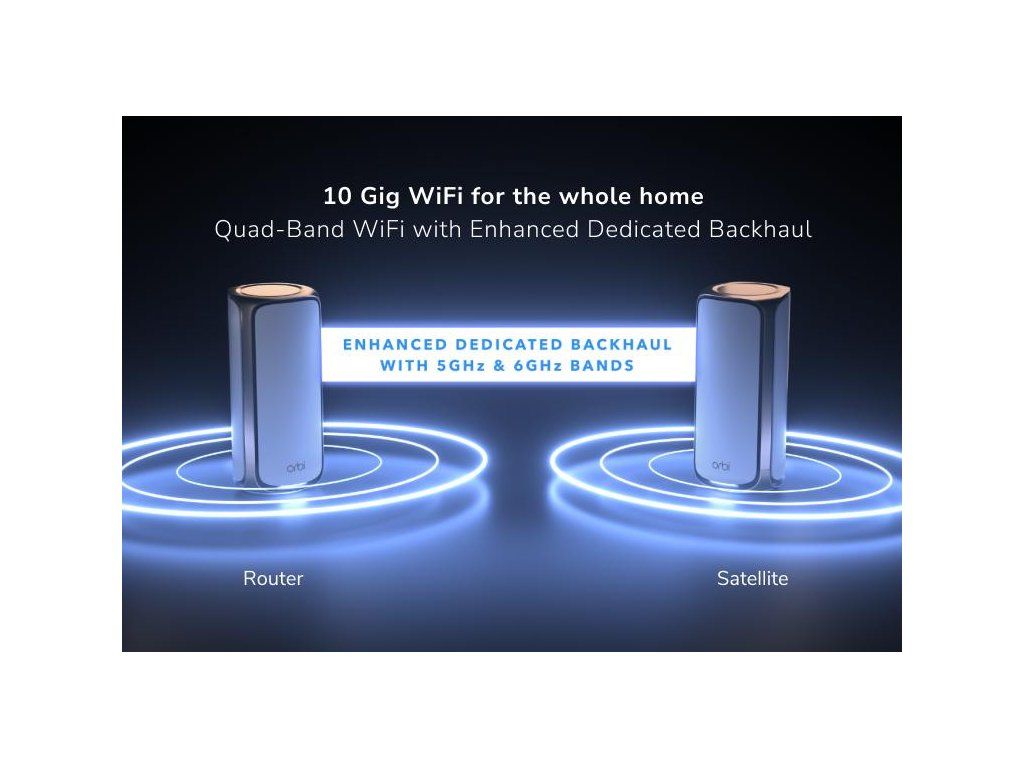 Obecné VxŠxH 294,03 mm x 144,38 mm x 130,79 mm Hmotnost *1,79 kg WiFi pokrytí *613.1601 m2 Router Samostatné pokrytí WiFi * 306,58 m2 Rychlost *BE27000 (11 530 + 8 647 + 5 765 + 1 147 Mbps)† Simultánní Quad-Band WiFi s vyhrazeným backhaul *6 GHz3 (4x4/320 MHz, 4K-QAM): 11 530 Mbps *5GHz-1 (4x4/240MHx, 4K-QAM): 8 647 Mb/s, vyhrazený backhaul *5 GHz-2 (4x4/160 MHz, 4K-QAM): 5 765 Mb/s *2,4 GHz (4x4/40 MHz, 1K-QAM): 1 147 Mbps Procesor *Čtyřjádrový procesor 2,2 GHz Paměť *4 GB Flash a 2 GB RAM Anténa *12 vysoce výkonných interních antén s vysoce výkonnými zesilovači Porty *1 x 10Gig internetový WAN port *1 x 10Gbps Ethernet LAN port *4 x 10/100/1000/2500Mbps Multi-Gig Ethernet LAN porty Satelit Samostatné pokrytí WiFi * 306,58 m2 Rychlost *BE27000 (11 530 + 8 647 + 5 765 + 1 147 Mbps)† Simultánní Quad-Band WiFi s vyhrazeným backhaul *6 GHz3 (4x4/320 MHz, 4K-QAM): 11 530 Mbps *5GHz-1 (4x4/240MHx, 4K-QAM): 8 647 Mb/s, vyhrazený backhaul *5 GHz-2 (4x4/160 MHz, 4K-QAM): 5 765 Mb/s *2,4 GHz (4x4/40 MHz, 1K-QAM): 1 147 Mbps Anténa *12 vysoce výkonných interních antén s vysoce výkonnými zesilovači Porty *1 x 10Gbps Ethernet LAN port *2 x 10/100/1000/2500Mbps Multi-Gig Ethernet LAN porty Zabezpečení *WPA3, VPN, Firmware Update, Rozdílné WiFi sítě, Aplikace OrbiDodatočné parametre