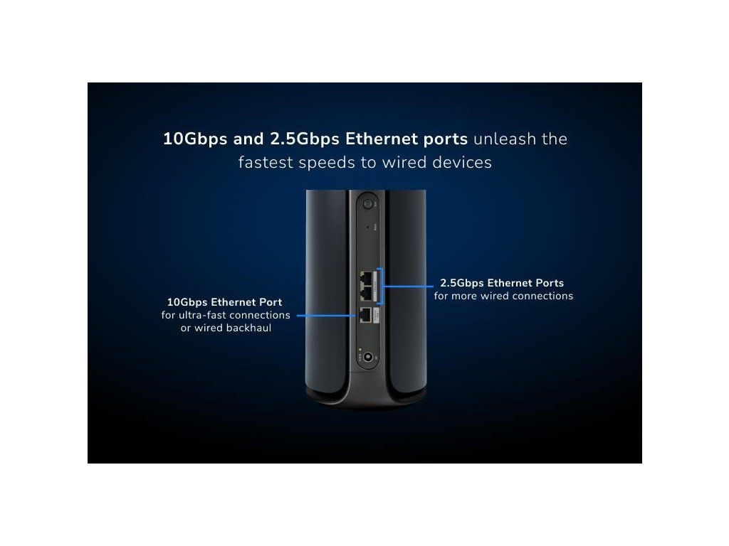 Fyzické VxŠxH *294,03 mm x 144,38 mm x 130,79 mm Hmotnost *1,79 kg SATELIT WiFi pokrytí *306,58 m2 Rychlost *BE27000 (11 530 + 8 647 + 5 765 + 1 147 Mbps) Simultánní Quad-Band WiFi s vyhrazeným backhaul *6 GHz3 (4x4/320 MHz, 4K-QAM): 11 530 Mbps *5GHz-1 (4x4/240MHx, 4K-QAM): 8 647 Mb/s, vyhrazený backhaul *5 GHz-2 (4x4/160 MHz, 4K-QAM): 5 765 Mb/s *2,4 GHz (4x4/40 MHz, 1K-QAM): 1 147 Mbps Anténa *12 vysoce výkonných interních antén s vysoce výkonnými zesilovači Porty *1 x 10Gbps Ethernet LAN port *2 x 10/100/1000/2500Mbps Multi-Gig Ethernet LAN porty Zabezpečení *WPA3, VPN, Firmware Update, Rozdílné WiFi sítě, Aplikace OrbiDodatočné parametre
