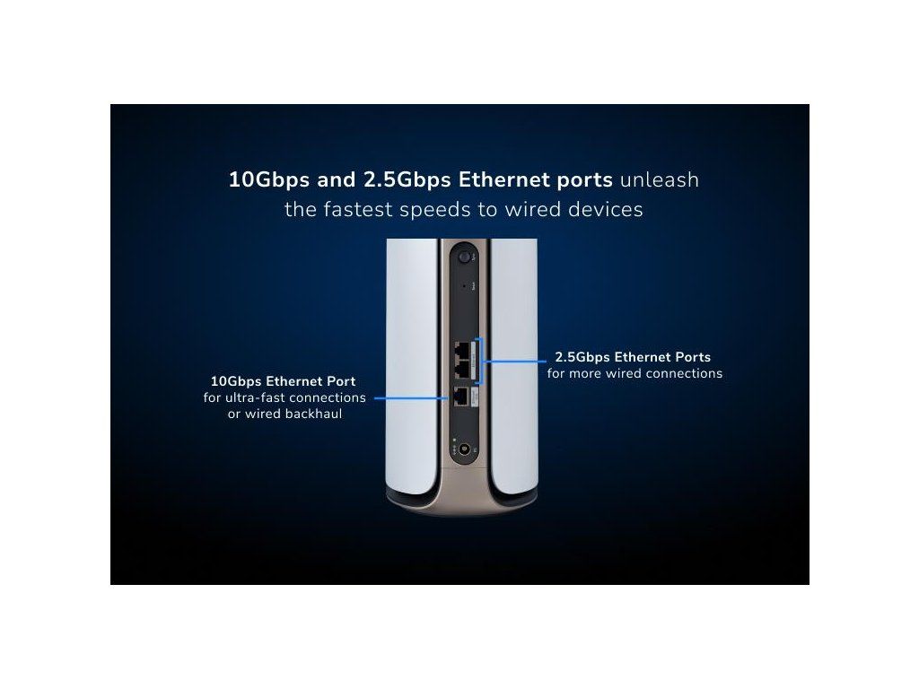 Fyzické VxŠxH *294,03 mm x 144,38 mm x 130,79 mm Hmotnost *1,79 kg SATELIT WiFi pokrytí *306,58 m2 Rychlost *BE27000 (11 530 + 8 647 + 5 765 + 1 147 Mbps) Simultánní Quad-Band WiFi s vyhrazeným backhaul *6 GHz3 (4x4/320 MHz, 4K-QAM): 11 530 Mbps *5GHz-1 (4x4/240MHx, 4K-QAM): 8 647 Mb/s, vyhrazený backhaul *5 GHz-2 (4x4/160 MHz, 4K-QAM): 5 765 Mb/s *2,4 GHz (4x4/40 MHz, 1K-QAM): 1 147 Mbps Anténa *12 vysoce výkonných interních antén s vysoce výkonnými zesilovači Porty *1 x 10Gbps Ethernet LAN port *2 x 10/100/1000/2500Mbps Multi-Gig Ethernet LAN porty Zabezpečení *WPA3, VPN, Firmware Update, Rozdílné WiFi sítě, Aplikace OrbiDodatočné parametre