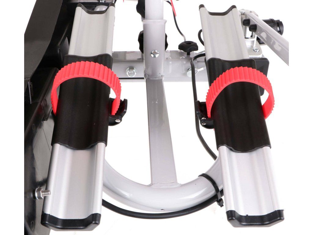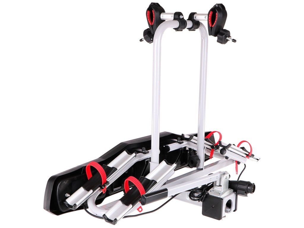 Spolehlivý nosič kol k upevnění na kouli tažného zařízení BIKE 2 pro 2 jízdní kola. Nosič je vyroben z oceli a hliníku. Nosič disponuje jednoduchým systémem upevnění, se sklápěním pro přístup do kufru, s kompletně osvětleným panelem a místem pro registrační značku vozidla. Upevnění kola do nosiče se obejde bez nářadí, provádí se uchycením držáku na rám a dotažením pásků na kolech umístěných na základně. Mechanismus je uzamykací a nehrozí tak odcizení kola. Zajišťovací kolečko pro upevnění jízdního kola je nutné důkladně dotáhnout, aby se překonal odpor prokluzu v zamčené poloze. Nosič je zhotoven z oceli a každá ze základen jízdního kola je z hliníku. Nosič je vybaven panelem s osvětlením a místem pro uchycení registrační značky (SPZ). Světelný panel je připojen k zásuvce tažného zařízení vozidla pomocí 13-pólového konektoru a je vybaven kompletními zadními svítilnami, včetně osvětlení RZ (SPZ). I přes velké rozměry nosiče, je stále umožněn přístup do kufru a to díky důmyslné konstrukci a možnosti sklápění celého nosiče.Hlavní výhody: