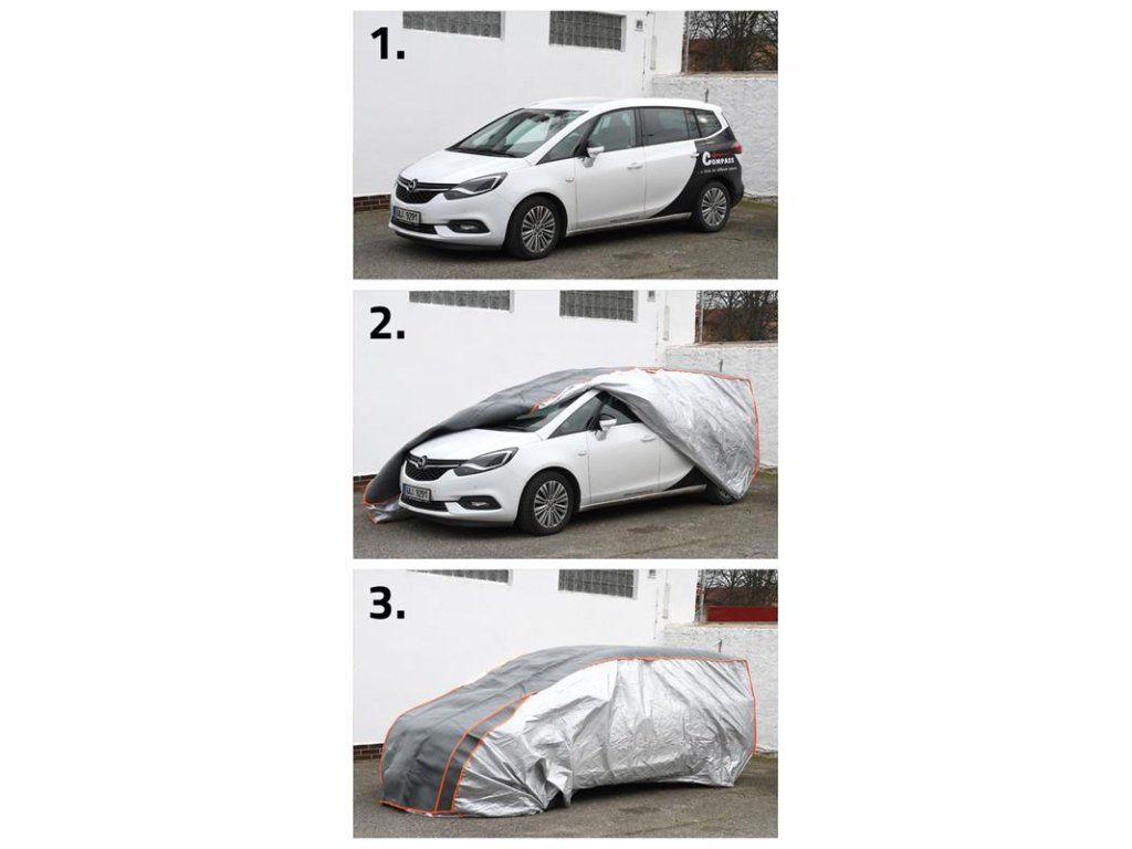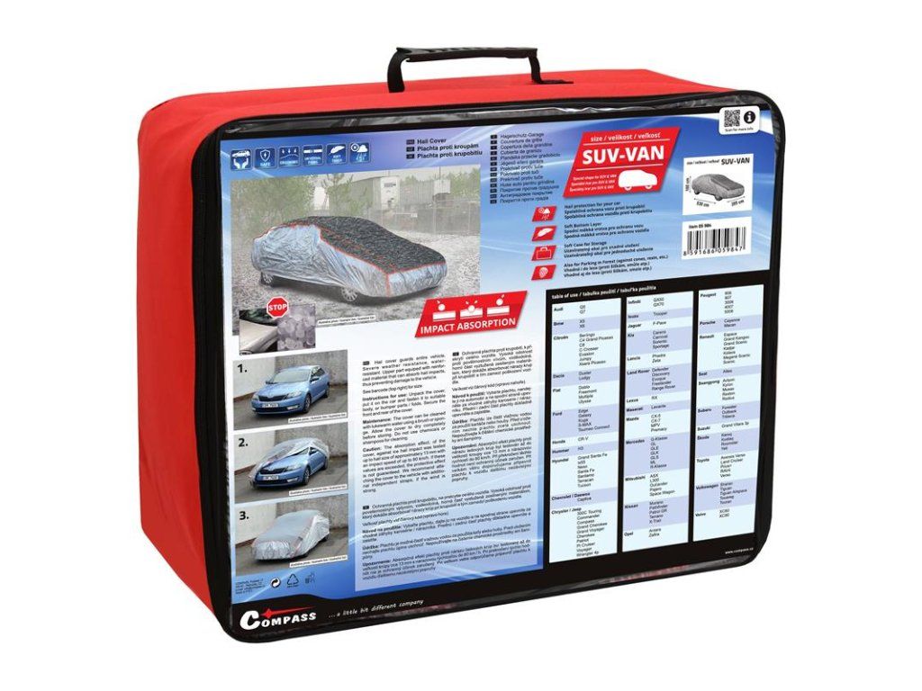 Ochranná plachta proti krupobitiu na zakrytie celého vozidla s vysokou odolnosťou proti poveternostným vplyvom. Vrchná časť je vystužená zosilneným materiálom, ktorý dokáže absorbovať nárazy krúp a zabrániť tak poškodeniu vozidla.