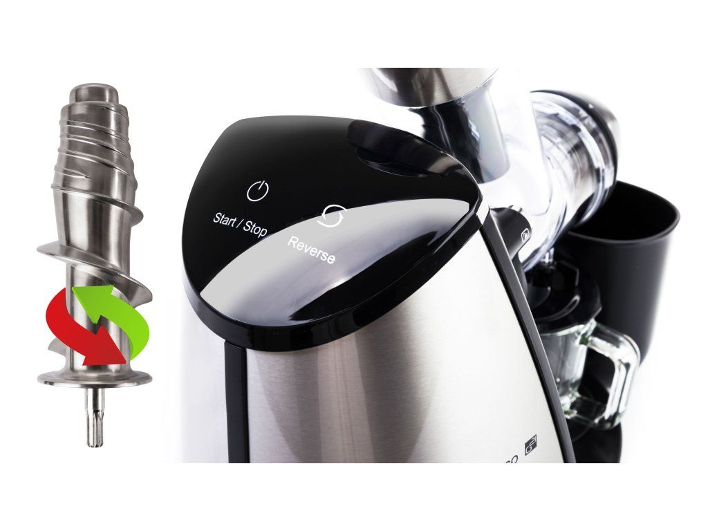 Ovládanie odšťavovača spočíva v prepínaní dvoch dotykových tlačidiel. Jedným tlačidlom prístroj zapnete a vypnete a druhým prepnete na spätný chod. Keď sa vám v šneku zasekne kúsok ovocia či zeleniny, nezúfajte. Prepnite na spätný chod, šnek sa uvoľní a môžete pokračovať v práci.