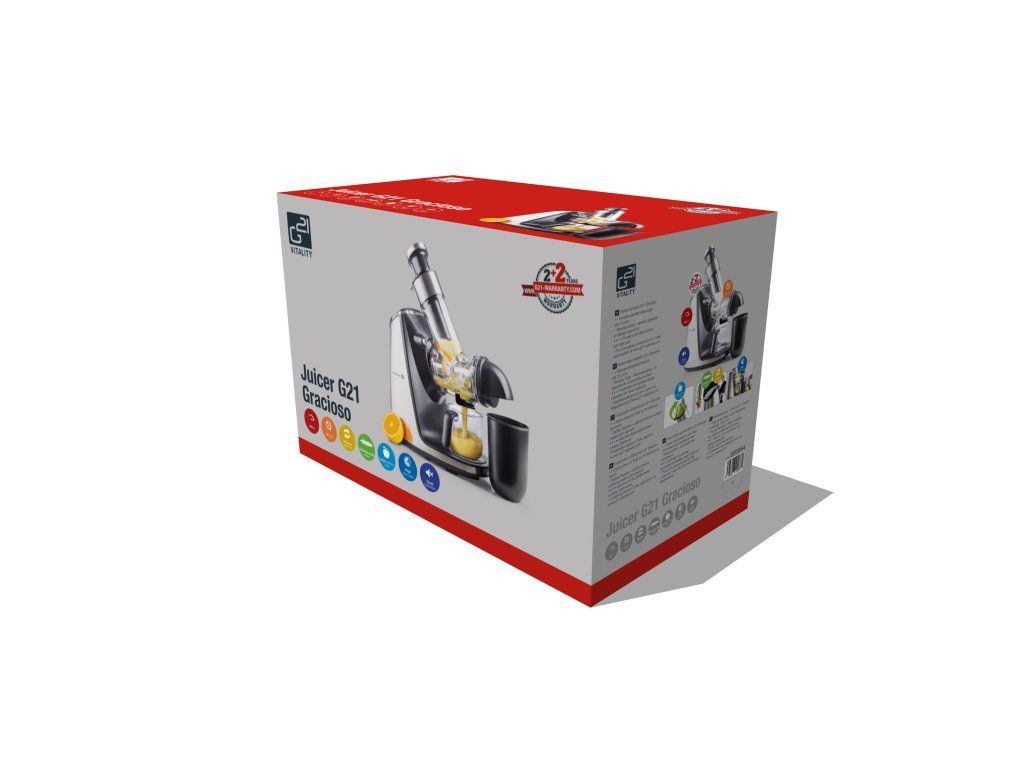 Za kvalitu tohto produktu ručíme 4 roky. K štandardnej záručnej lehote 2 roky získate registráciou na webe http://g21-warranty.com predĺženie záruky o ďalšie 2 roky. Využite túto možnosť a po kúpe sa zaregistrujte. Predĺžená záruka 2 + 2 roky sa oplatí! Predĺžená záruka 2 + 2 roky sa vzťahuje na najdôležitejšiu časť odšťavovača – jeho telo, teda základňu so všetkými tlačidlami, motorom a elektronikou.