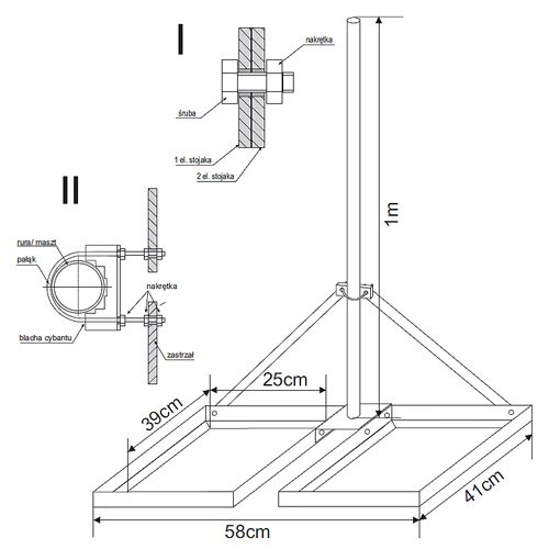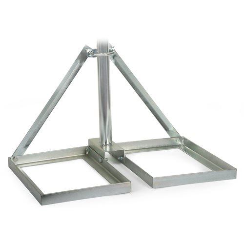 MB-1000 E8740 stožár je vhodný pro montáž antény na rovné, pevné střechy či terasy. Instalace se používá tam, kde není možnost připevnění typické stožáry s kotvícími prvky do podlahy či krovu střechy nebo zdi. Stožár lze použít pro montáž satelitních antén. Stožár je přizpůsoben pro použiti s nákladem betonových bloků o rozměrech 38x24x12, 38x20x12 a 30x24x12 [cm] v počtu od 4 do 8 kusů. Nastavené bloky se musí upevnit dohromady plastovým pásem. Vertikální ocelová trubka je přivařena k 3 mm obrubě z ocelového plechu. Obruba má být našroubována dvěma ocelovými rámy z pevných úhlových částí (39x25 cm). Ocelové díly jsou pozinkované. Výška stožáru je 1 m Plastový uzávěr brání vodě ve vstupu do vnitřku trubky. Technická data: • Výška: 1 m • Plná velikost základny: 58x41 cm • Vnitřní rozměry každého rámu (u betonových bloků): 39x25 cmDodatočné parametre
