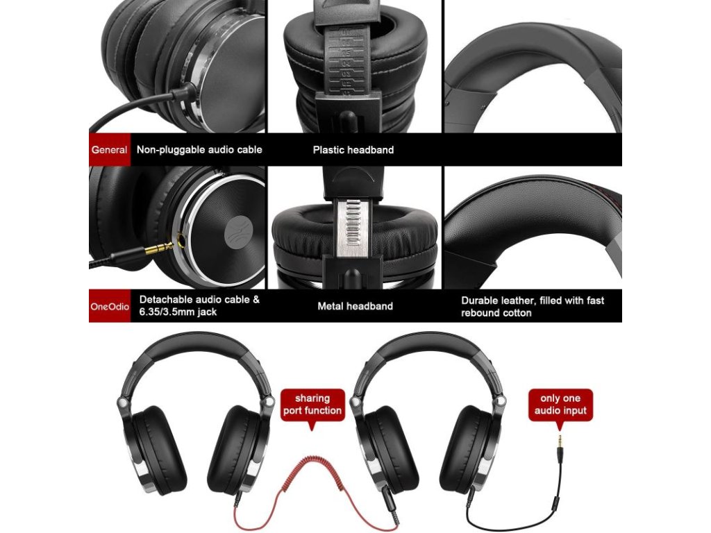 OneOdio Pro-10 Technické specifikace *Typ sluchátek: Uzavřená, kabelová *Měnič: 50 mm *Impedance: 32 , *Citlivost: 110 dB ±3 dB *Frekvenční rozsah: 20 Hz – 40 kHz *Maximální vstupní výkon: 1600 mW *Konektory: 3,5 mm / 6,35 mm stereo jack *Kabel 1: Spirálový, 2–3 m (3,5 mm na 6,35 mm) *Kabel 2: Rovný, 1,2 m (3,5 mm na 3,5 mm) s mikrofonem *Technologie Shareport: Ano Rozměry a hmotnost *Hmotnost: 0,42 kg *Rozměry balení: 170 x 104 x 140 mm Obsah balení *1× OneOdio Pro-10 sluchátka *1× Přenosné pouzdro *1× Spirálový kabel 3,5 mm na 6,35 mm (2–3 m) *1× Rovný kabel 3,5 mm na 3,5 mm s mikrofonem (1,2 m) *1× Uživatelská příručkaDodatočné parametre