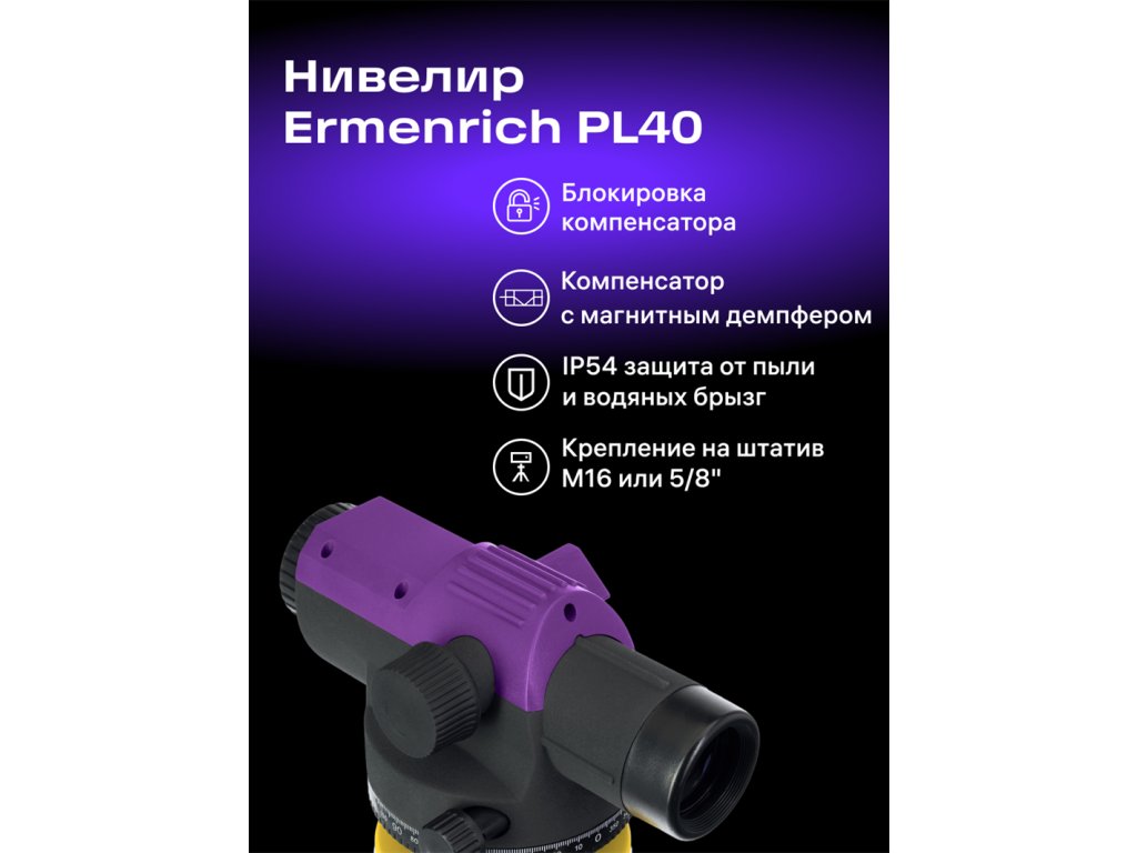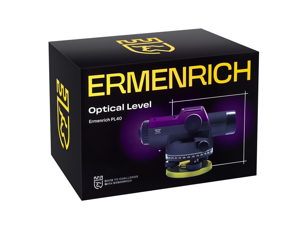 Optický nivelační přístroj Ermenrich PL40 je určen k měření na zemi: výškových rozdílů, úhlů a vzdáleností. Jeho konstrukce využívá kyvadlový kompenzátor s magnetickým tlumičem, který snižuje vibrace účinněji než podobná zařízení, která používají vzduchový tlumič. Proto je nivelační přístroj Ermenrich PL40 vhodný pro použití na stavbách v okolí těžkých strojů, které vytvářejí silné vibrace. Lépe se také vyrovnává s vibracemi, které jsou způsobeny větrem.