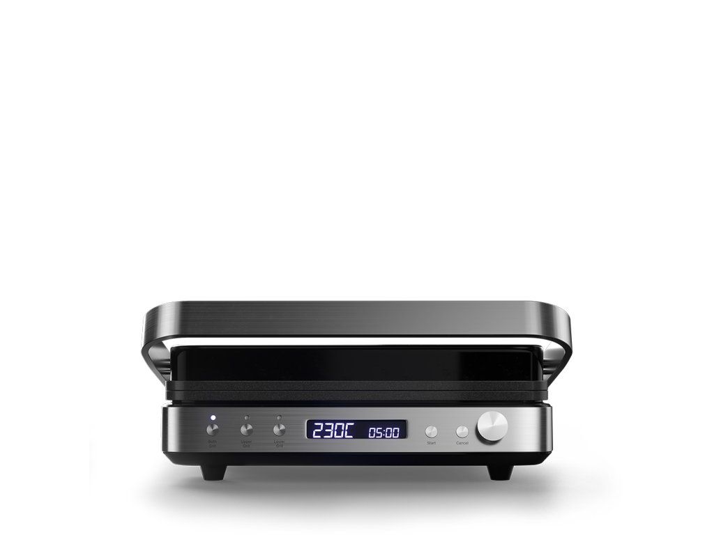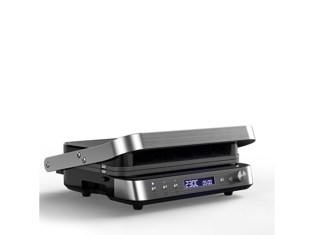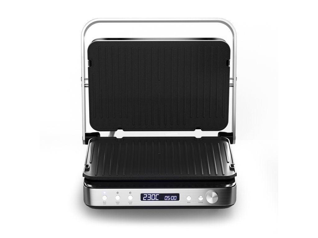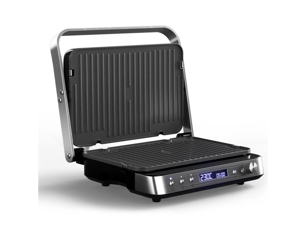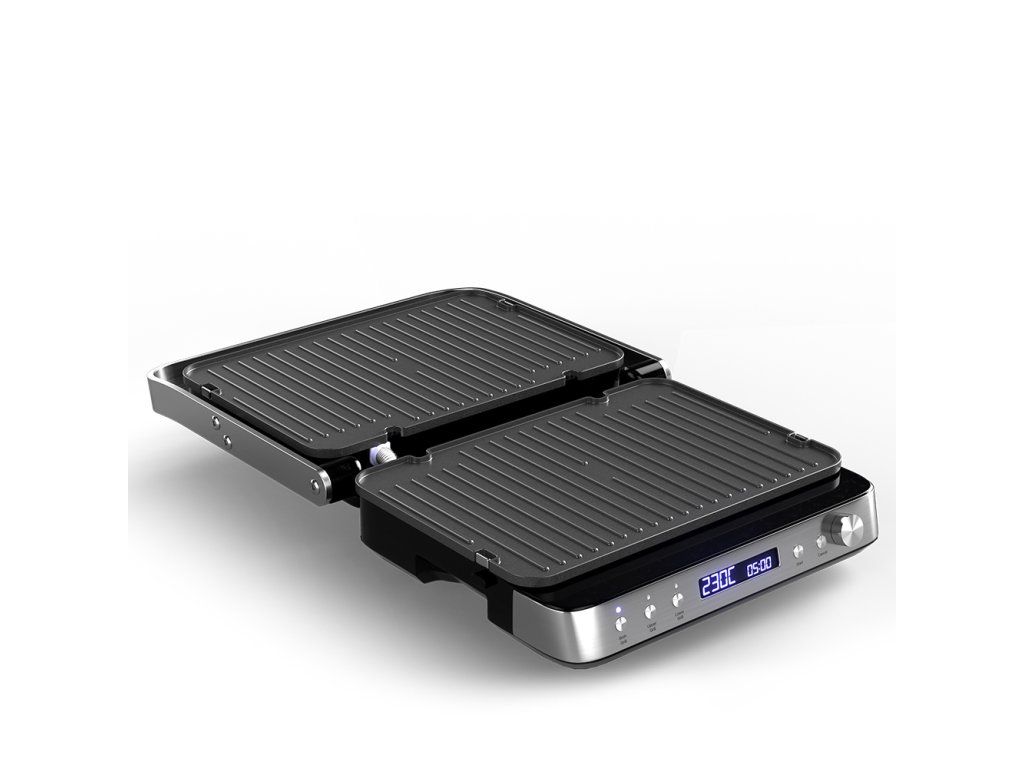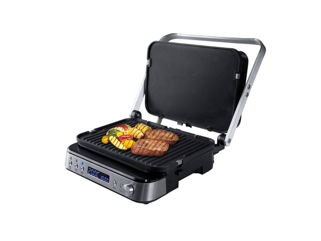 Výkonný elektrický stolový kontaktný gril. Funkcia otvoreného aj kontaktného grilu. Samostatne regulovateľná teplota (každá plocha osobitne). Kombinácia 2 grilovacích plôch (hladký a rebrovaný povrch). Variabilné nastavenie teploty 80 až 230 °C. Grilovacie platne s nepriľnavou vrstvou. Časovač s automatickým vypnutím. Veľký LCD displej. Zvuková signalizácia. Tepelne izolovaná rukoväť. Miska na odkvapkávanie šťavy a oleja. Jednoduché čistenie, odnímateľné grilovacie platne. Protišmykové gumové nožičky pre väčšiu stabilitu. Napájanie: 230V~ 50 Hz, 2 000 W.Dodatočné parametre
